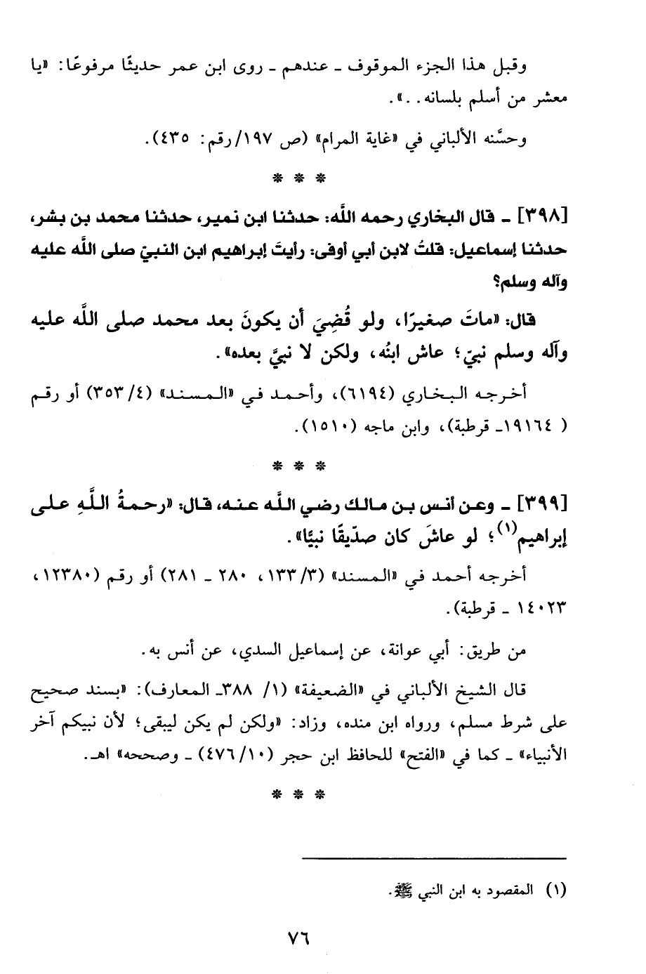 398 - قال البخاري -رَحِمَهُ اللهُ-: حدثنا ابن نمير، حدثنا محمد بن بشر، حدثنا إسماعيل: قلتُ لابن أبي أوفى: رأيتَ إبراهيم ابن النبيّ - صلى الله عليه وآله وسلم -؟