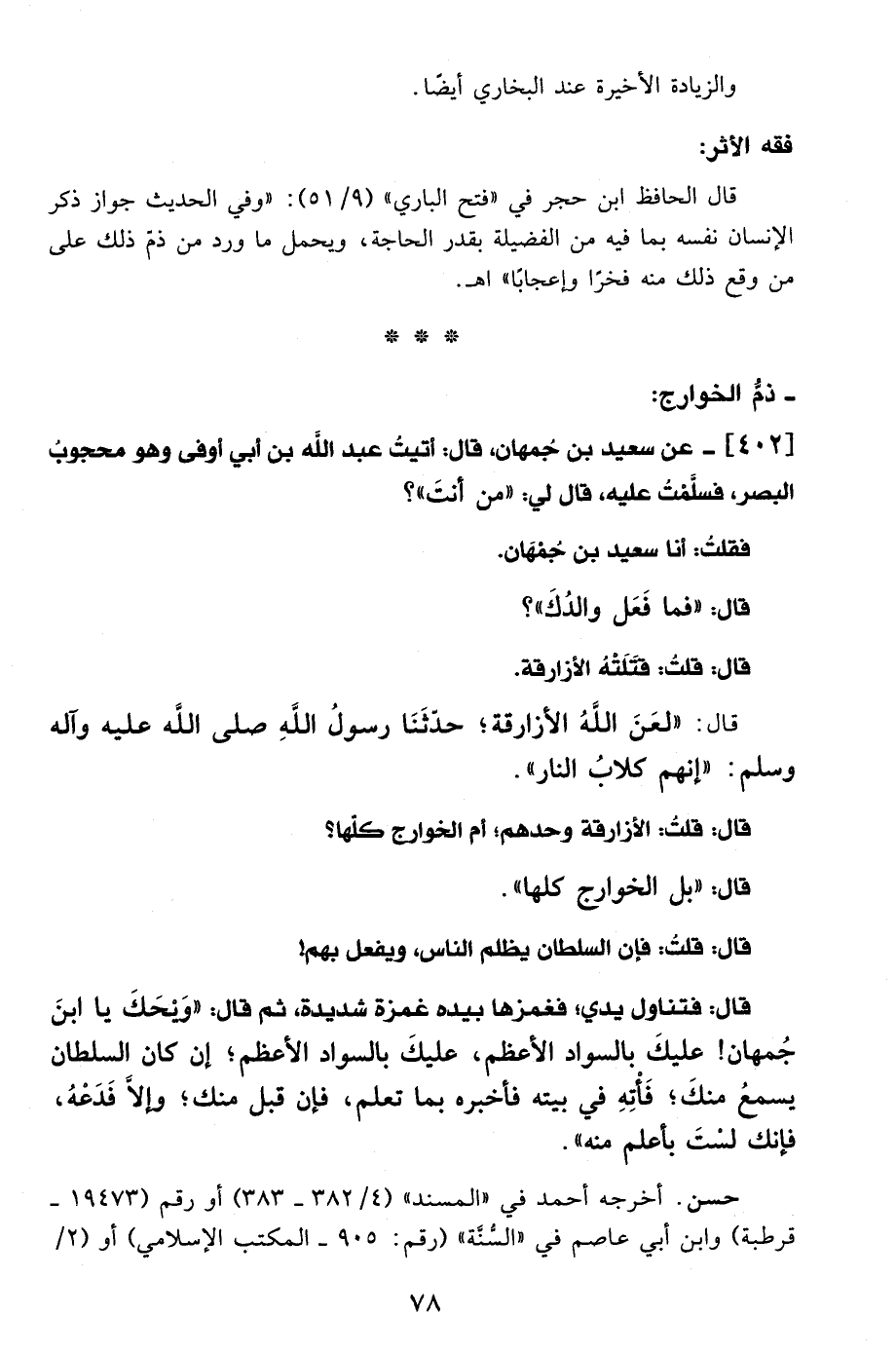 402 - عن سعيد بن جُمهان، قال: أتيتُ عبد الله بن أبي أوفى وهو محجوبُ البصر، فسلَّمْتُ عليه، قال لي: "من أنتَ"؟