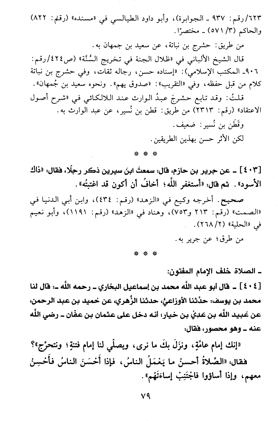 403 - عن جرير بن حازم، قال: سمعتُ ابنَ سيرين ذكر رجلاً، فقال: "ذاك الأسود". ثم قال: "أستغفر الله؛ أخافُ أن أكون قد اغتبتُه".