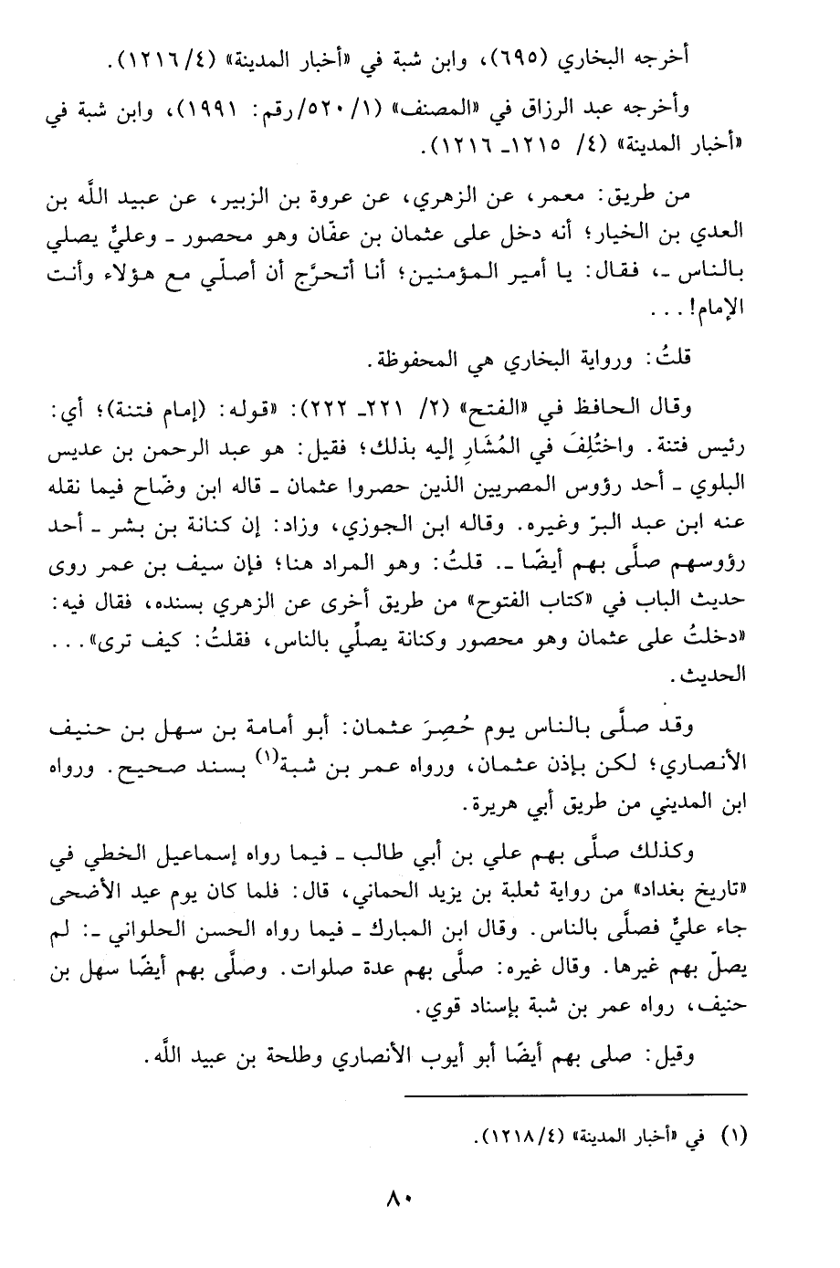 من طريق: معمر، عن الزهري، عن عروة بن الزبير، عن عبيد الله بن العدي بن الخيار؛ أنه دخل على عثمان بن عفّان وهو محصور -وعليٌّ يصلي بالناس-، فقال: يا أمير المؤمنين؛ أنا أتحرَّج أن أصلّي مع هؤلاء وأنت الإمام! ...