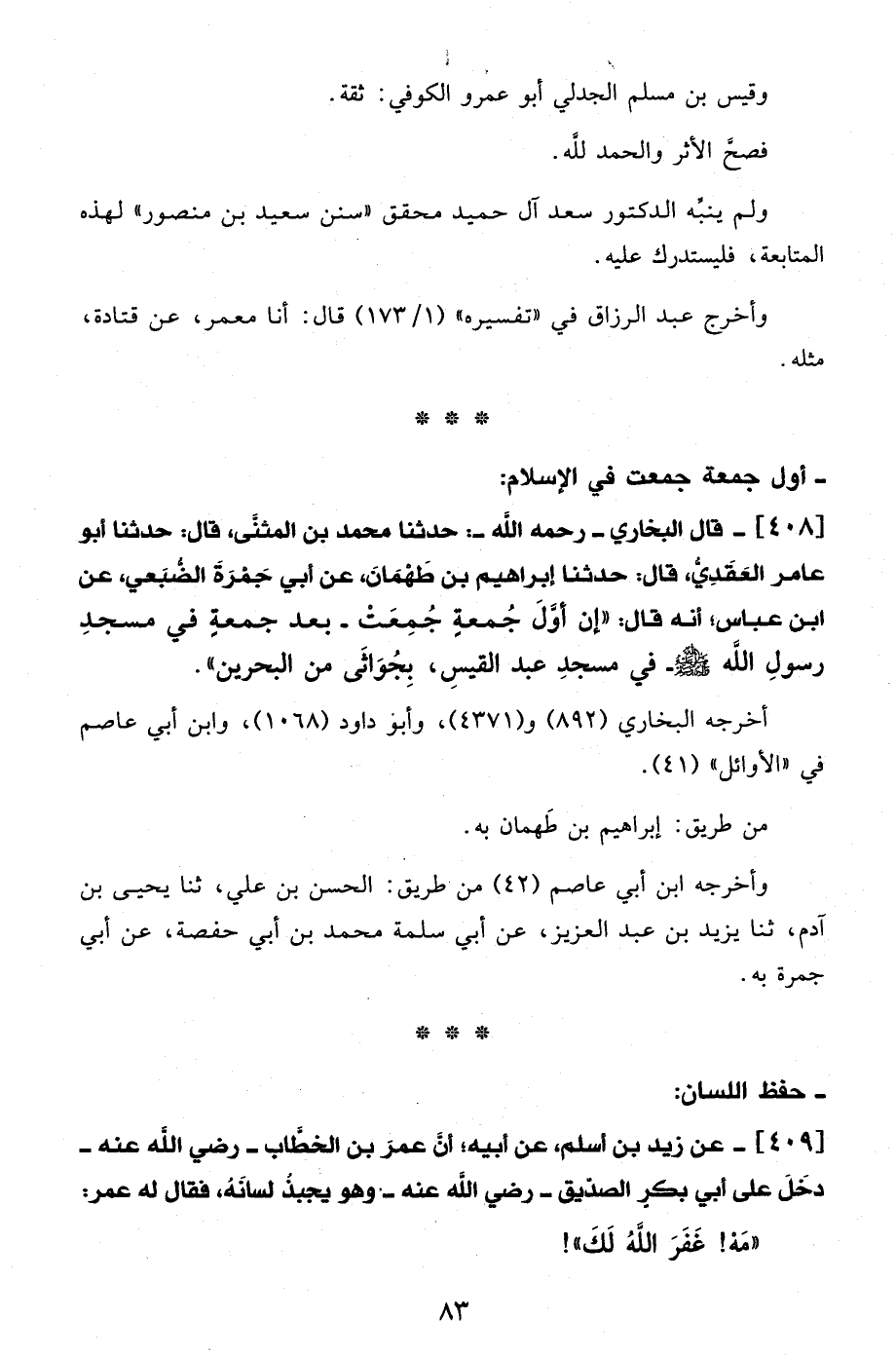 408 - قال البخاري -رَحِمَهُ اللهُ-: حدثنا محمد بن المثنَّى، قال: حدثنا أبو عامر العَقَدِيُّ، قال: حدثنا إبراهيم بن طَهْمَانَ، عن أبي جَمْرَةَ الضُّبَعي، عن ابن عباس، أنه قال: "إن أوَّلَ جُمعةِ جُمِعَتْ - بعد جمعةِ في مسجدِ رسولِ الله - صلى الله عليه وسلم - في مسجدِ عبد القيسِ، بِجُوَاثَى من البحرين".