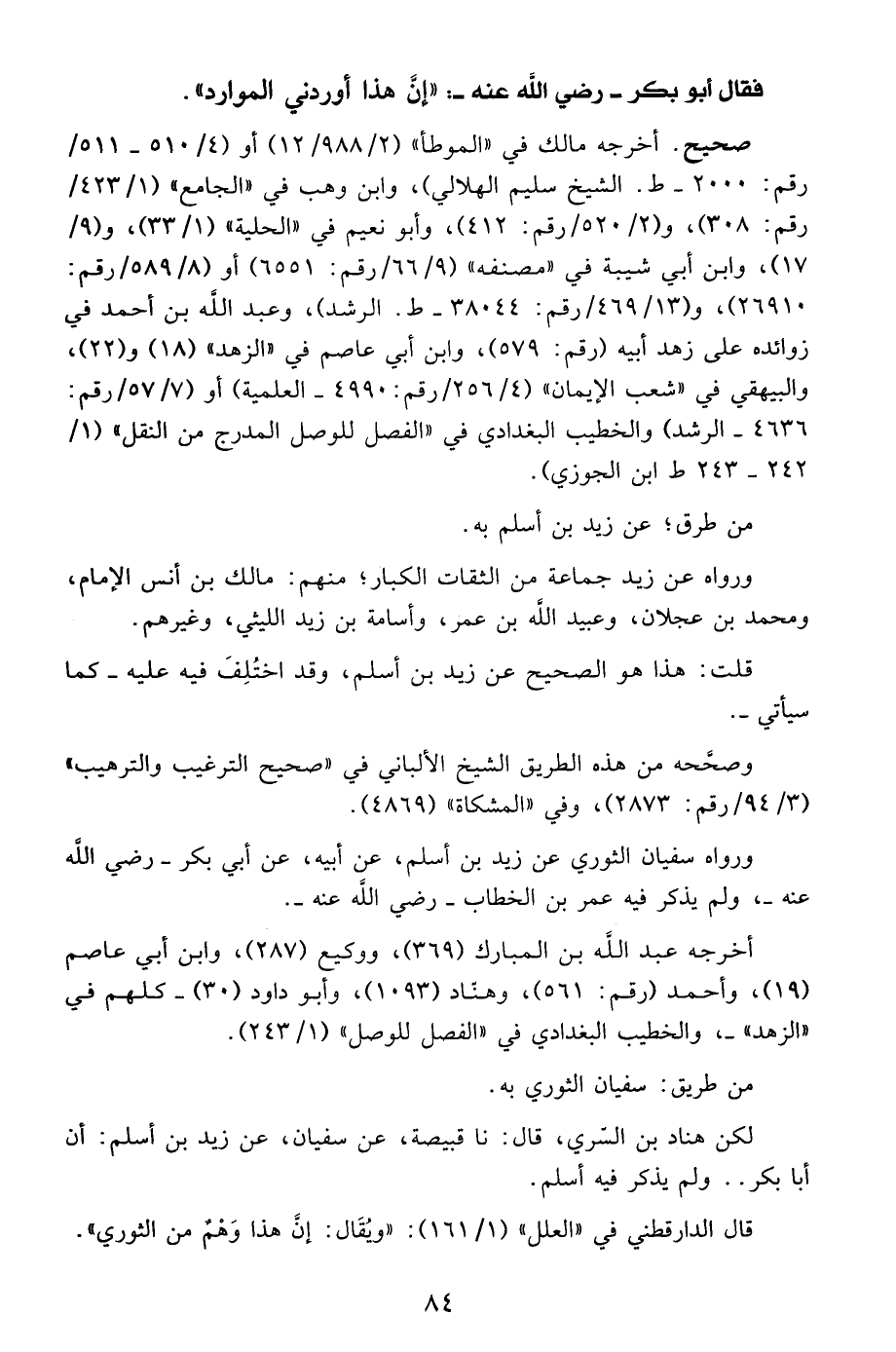 ورواه سفيان الثوري عن زيد بن أسلم، عن أبيه، عن أبي بكر - رضي الله عنه -، ولم يذكر فيه عمر بن الخطاب - رضي الله عنه -.
