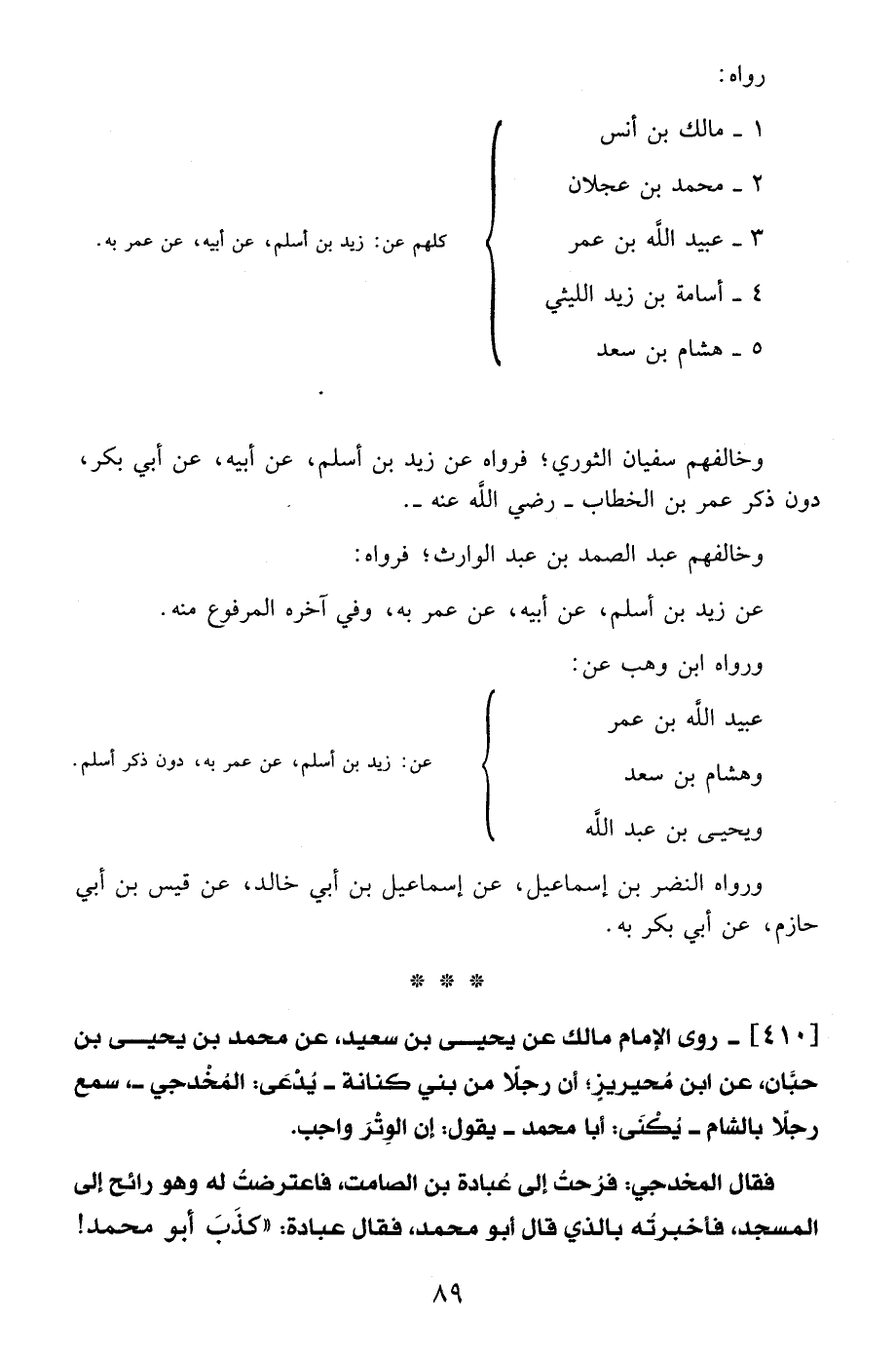 401 - روى الإمام مالك عن يحيى بن سعيد، عن محمد بن يحيى بن حبَّان، عن ابن مُحيريزٍ؛ أن رجلاً من بني كنانة- يُدْعَى: المُخْدجي-، سمع رجلًا بالشام -يُكْنَى: أبا محمد- يقول: إن الوِتْرَ واجب.