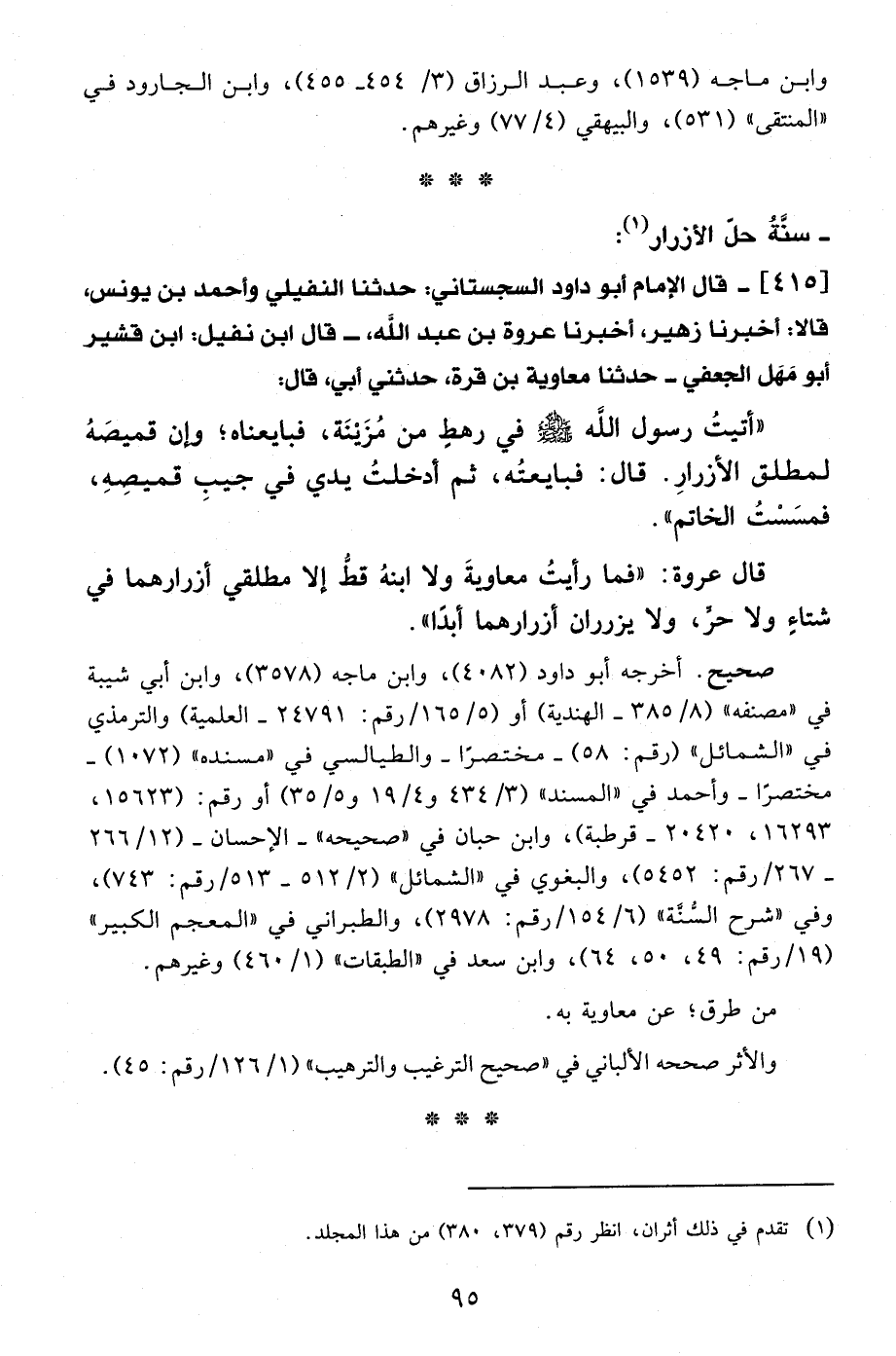 415 - قال الإمام أبو داود السجستاني: حدثنا النفيلي وأحمد بن يونس، قالا: أخبرنا زهير، أخبرنا عروة بن عبد الله،- قال ابن نفيل: ابن قشير أبو مَهَل الجعفي- حدثنا معاوية بن قرة، حدثني أبي، قال: