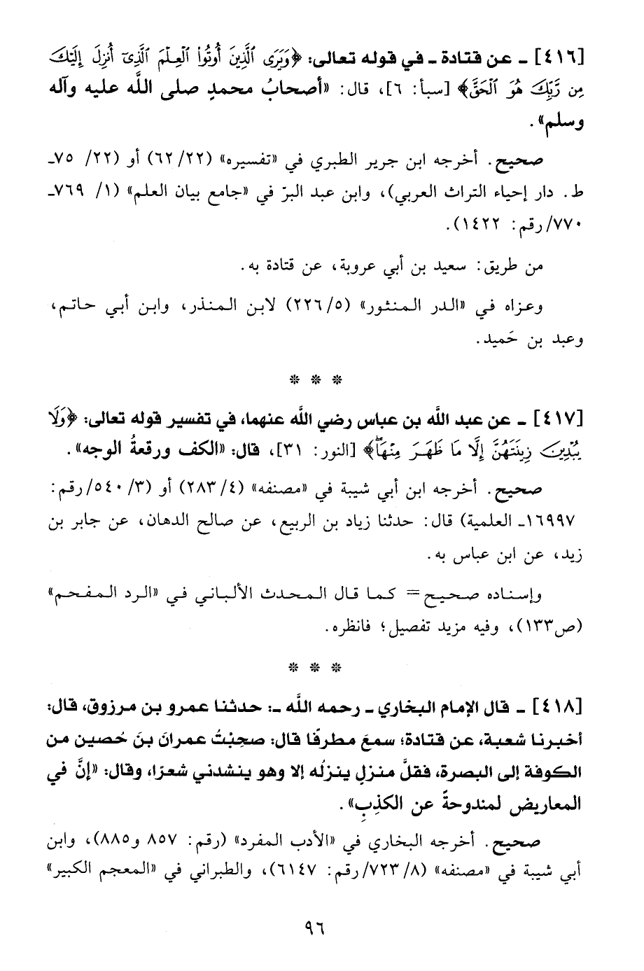 417 - عن عبد الله بن عباس - رضي الله عنهما -، في تفسير قوله تعالى: {وَلَا يُبْدِينَ زِينَتَهُنَّ إِلَّا مَا ظَهَرَ مِنْهَا} [النور: 31] قال: "الكف ورقعةُ الوجه".