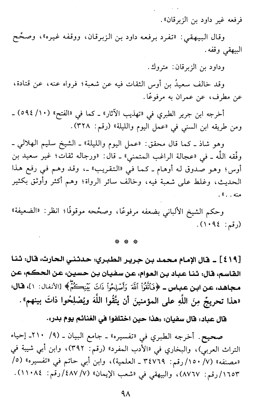 419 - قال الإمام محمد بن جرير الطبري: حدثني الحارث، قال: ثنا القاسم، قال: ثنا عباد بن العوام، عن سفيان بن حسين، عن الحكم، عن مجاهد، عن ابن عباس- {فَاتَّقُوا اللهَ وَأَصْلِحُوا ذَاتَ بَيْنِكُمْ} [الأنفال: 1]، قال: "هذا تحريجٌ مِنَ اللهِ على المؤمنينَ أن يتَقُوا الله ويُصْلِحُوا ذاتَ بينهم".