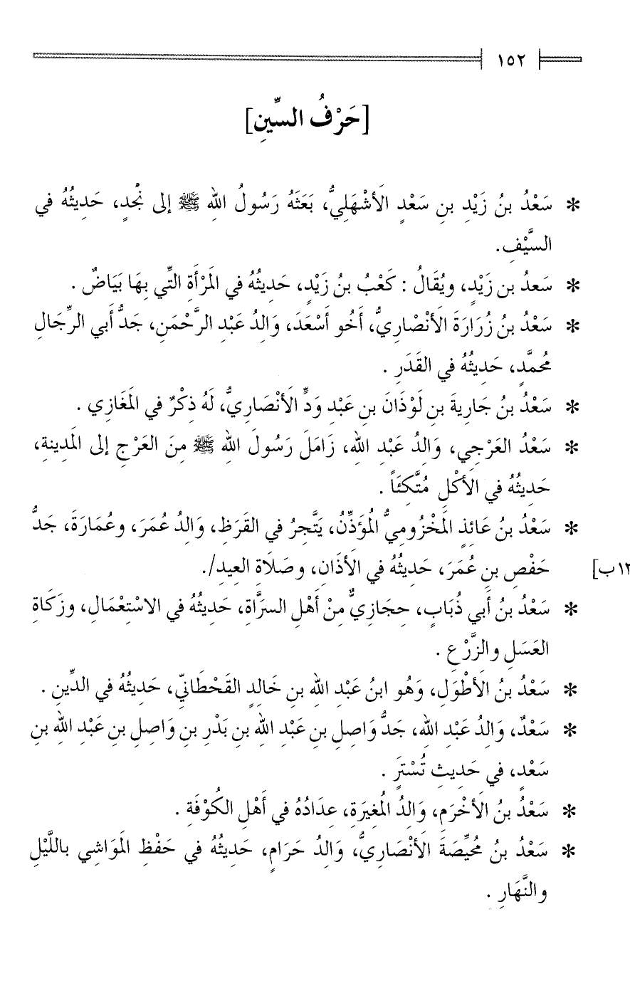 * سَعْدُ بنُ زَيْدِ بنِ سَعْدٍ الأَشْهَلِيُّ، بَعَثَهُ رَسُولُ الله - صلى الله عليه وسلم - إلى نجدٍ، حَدِيثُهُ في السَّيْفِ.