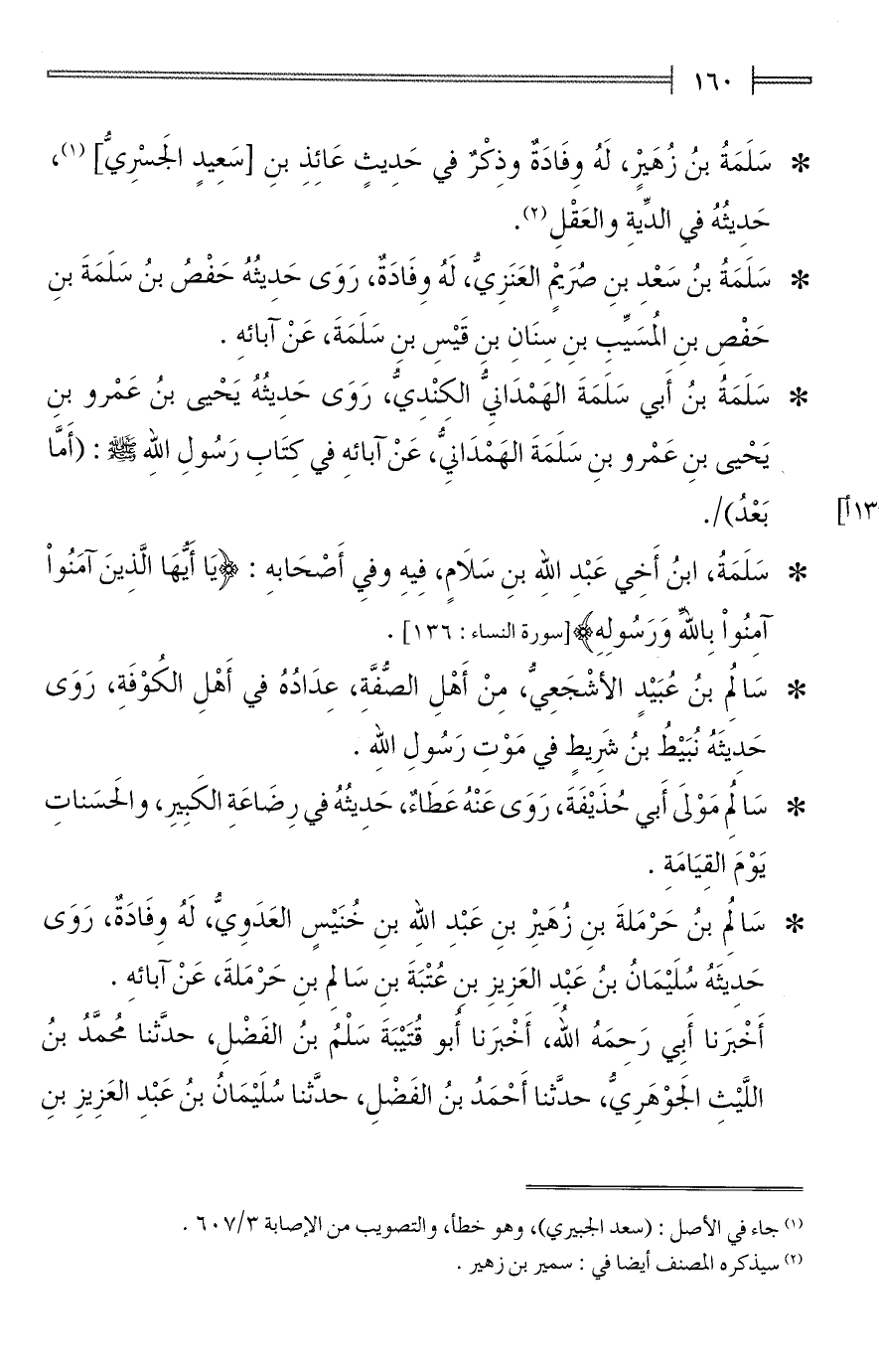* سَلَمَةُ، ابنُ أَخِي عَبْدِ الله بنِ سَلَامٍ، فِيهِ وفيِ أَصْحَابهِ: {يَا أَيُّهَا الَّذِينَ آمَنُوا آمِنُوا بِاللَّهِ وَرَسُولِهِ} [سورة النساء: 136].