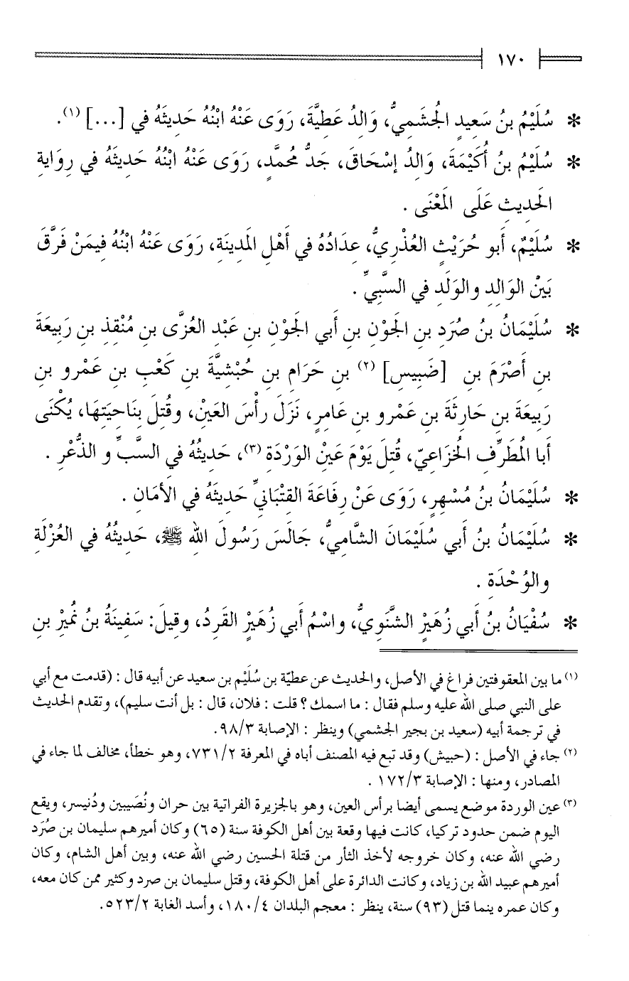 * سُلَيْمَانُ بنُ صُرَدِ بنِ الجَوْنِ بنِ أَبي الجَوْنِ بنِ عَبْدِ العُزَّى بنِ مُنْقِذِ بنِ رَبِيعَةَ بنِ أَصْرَمَ بنِ [ضَبِيسِ] (¬2) بنِ حَرَامِ بنِ حُبْشِيَّةَ بنِ كَعْبِ بنِ عَمْرو بنِ رَبِيعَةَ بن حَارِثَةَ بنِ عَمْرو بنِ عَامِرٍ، نَزَلَ رأسَ العَيْنِ، وقُتِلَ بنَاحيَتِهَا، يُكْنَى أَبا المُطَرِّفِ الخُزَاعِيّ، قُتِلَ يَوْمَ عَينِ الوَرْدَةِ (¬3)، حَدِيثُهُ في السَّبِّ والذُّعْرِ.