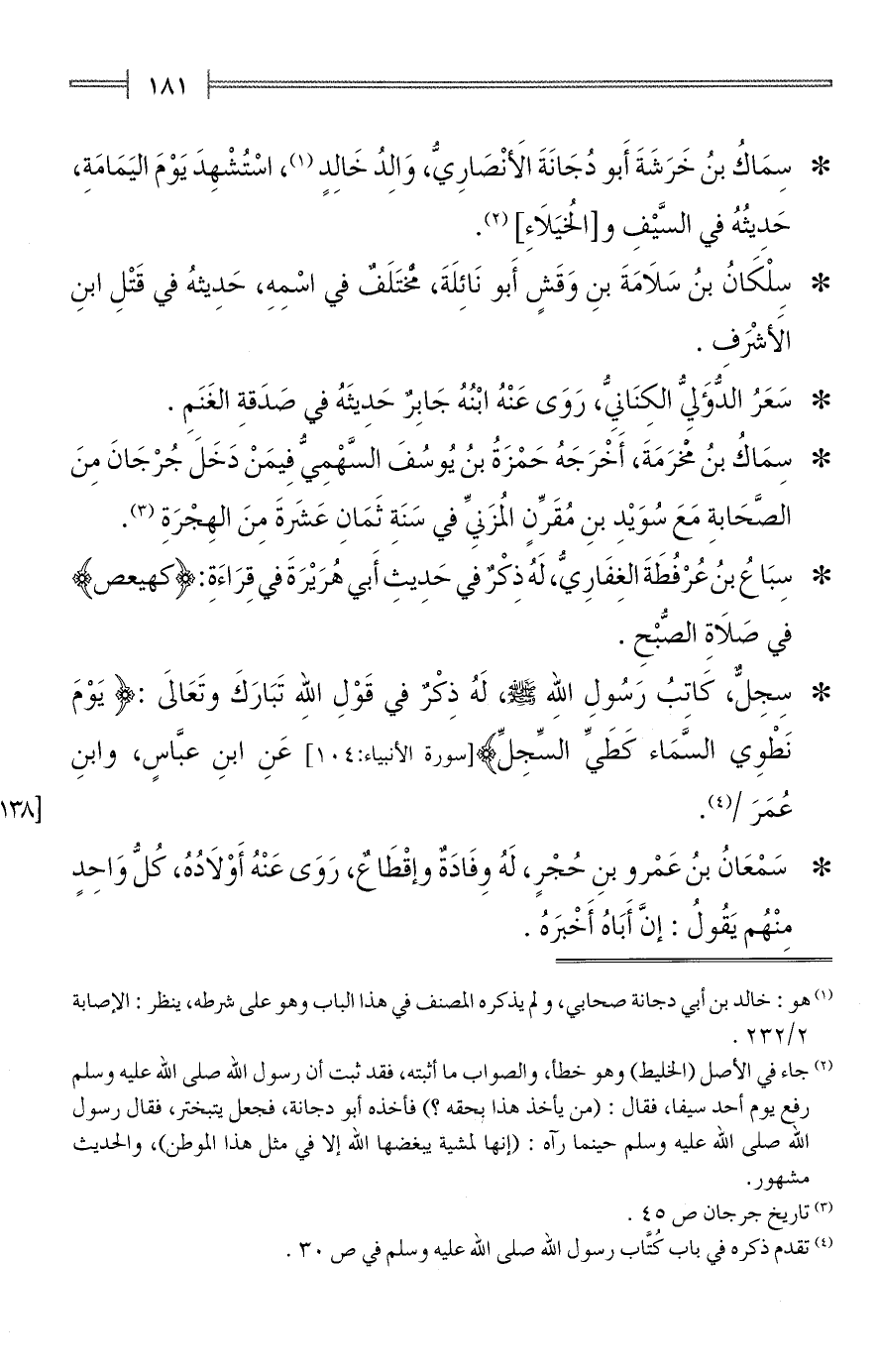 * سِمَاكُ بنُ خَرَشَةَ أَبو دُجَانَةَ الأَنْصَارِيُّ، وَالِدُ خَالِدٍ (¬1)، اسْتُشْهِدَ يَوْمَ اليَمَامَةِ، حَدِيثُهُ في السَّيْفِ و [الخُيَلَاءِ] (¬2).