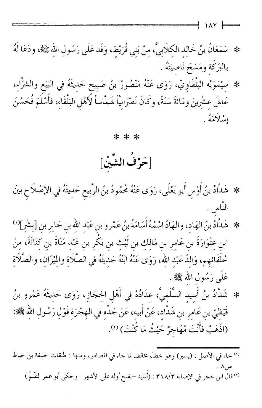 * شَدَّادُ بنُ أَسِيدٍ السُّلَمِيُّ، عِدَادُهُ في أَهْلِ الحِجَازِ، رَوَى حَدِيثَهُ عَمْرو بنُ قَيْظِيّ بنِ عَامِرِ بنِ شَدَّادٍ، عَنْ أَبيهِ، عَنْ جَدِّهِ في الهِجْرَةِ قَوْلِ رَسُولِ الله - صلى الله عليه وسلم -: (اذْهَبْ فأَنْتَ مُهَاجِرٌ حَيْثُ مَا كُنْتَ) (¬2).