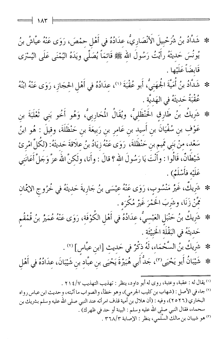 * شَدَّادُ بنُ شُرَحْبِيلَ الأَنْصارِيُّ، عِدَادُهُ في أَهْلِ حِمْصَ، رَوَى عَنْهُ عيَّاشُ بنُ يُونُسَ حَدِيثَهُ رأَيْتُ رَسُولَ الله - صلى الله عليه وسلم - قَائِمًا يُصَلِّي ويَدَهُ اليُمْنَى عَلَى اليُسْرَى قَابِضًا عَلَيْها.