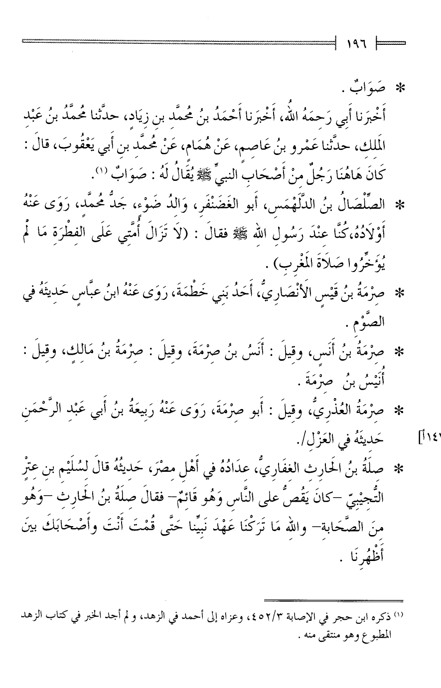 أَخْبَرنا أَبِي رَحِمَهُ اللهُ، أَخْبَرنا أَحْمَدُ بنُ مُحمَّدِ بنِ زِيَادٍ، حدَّثنا مُحمَّدُ بنُ عَبْدِ المَلِكِ، حدَّثنا عَمْرو بنُ عَاصِمٍ، عَنْ هُمَامٍ، عَنْ مُحمَّدِ بنِ أَبي يَعْقُوبَ، قالَ: كَانَ هَاهُنَا رَجُلٌ مِنْ أَصْحَابِ النبيِّ - صلى الله عليه وسلم - يُقَالُ لَهُ: صَوَابٌ (¬1).