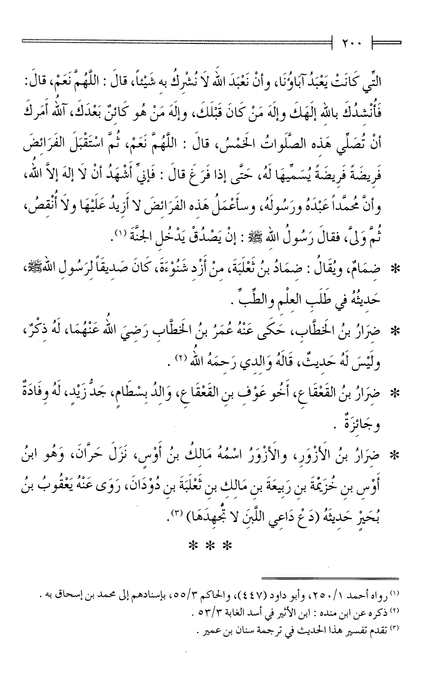 التِّي كَانَتْ يَعْبَدُ آبَاؤُنَا، وأنْ نَعْبَدَ الله لَا نُشْرِكُ به شَيْئًا، قالَ: اللَّهُمَّ نَعَمْ، قالَ: فَأُنْشِدُكَ باللهِ إلَهَكَ وإلَهَ مَنْ كَانَ قَبْلَكَ، وإلَهَ مَنْ هُو كَائِنٌ بَعْدَكَ، آللهُ أَمَركَ أنْ تُصلِّي هَذِه الصَّلَواتُ الخَمْسُ، قالَ: اللَّهُمَّ نَعَمْ، ثُمَّ اسْتَقْبَلَ الفَرَائِضَ فَرِيضَةً فَرِيضَةً يُسَمِّيهَا لَهُ، حَتَّى إذا فَرَغَ قالَ: فَإنِّي أَشْهَدُ أنْ لَا إلهَ إلَّا اللهُ، وأنَّ مُحمَّدًا عَبْدَهُ ورَسُولَهُ، وسأَعْمَلُ هَذِه الفَرَائِضَ لا أَزِيدُ عَلَيْهَا ولَا أُنْقِصُ، ثُمَّ وَلىَّ، فقالَ رَسُولُ الله - صلى الله عليه وسلم -: إنْ يَصْدُقْ يَدْخُلِ الجنَّةَ (¬1).