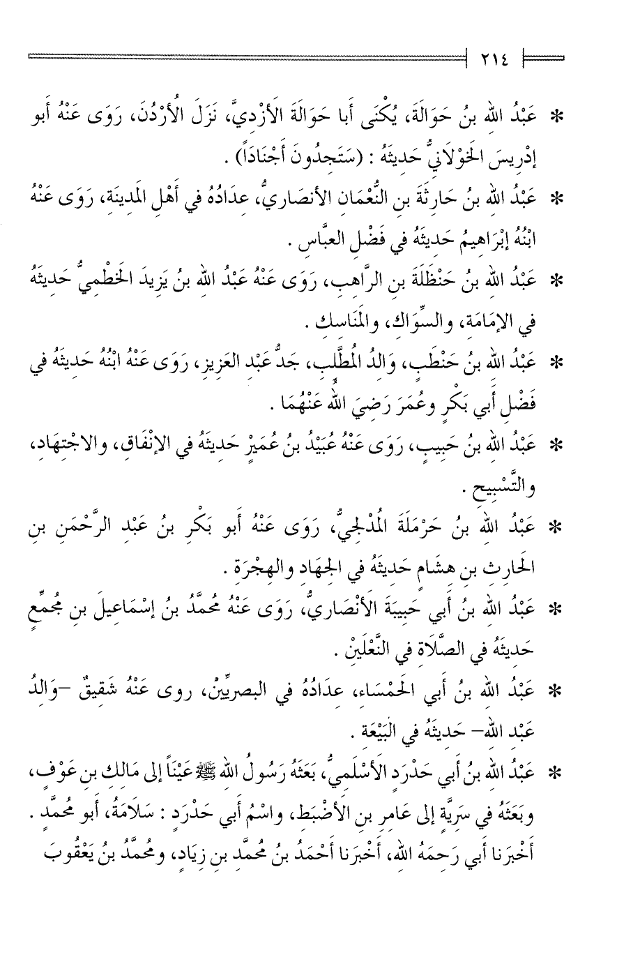* عَبْدُ اللهِ بنُ حَنْظَلَةَ بنِ الرَّاهِبِ، رَوَى عَنْهُ عَبْدُ الله بنُ يَزِيدَ الخَطْمِيُّ حَدِيثَهُ في الإمَامَةِ، والسِّوَاكِ، والمَنَاسِكِ.
