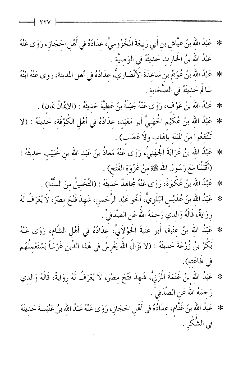 * عَبْدُ الله بنُ عُكْبَرةَ، رَوَى عَنْهُ مُجاهِدٌ حَديثَهُ: (التَّخْلِيلُ مِنَ السُّنَّةِ).