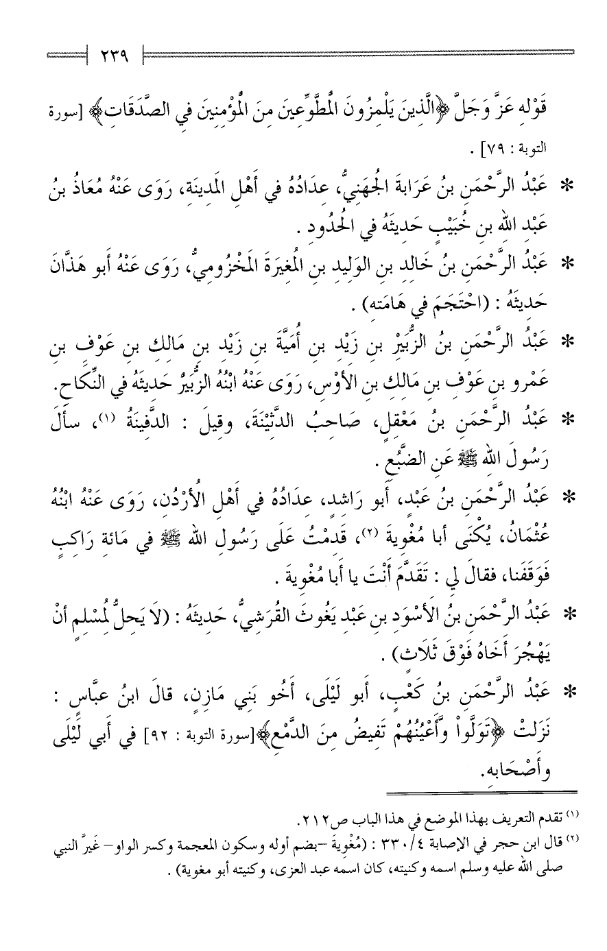 * عَبْدُ الرَّحْمَنِ بنُ كَعبٍ، أَبو لَيْلَى، أَخُو بَنِي مَازِنٍ، قالَ ابنُ عبَّاسٍ: نَزَلتْ {تَوَلَّوْا وَأَعْيُنُهُمْ تَفِيضُ مِنَ الدَّمْعِ} [سورة التوبة: 92] في أبي لَيْلَى وأَصْحَابه.
