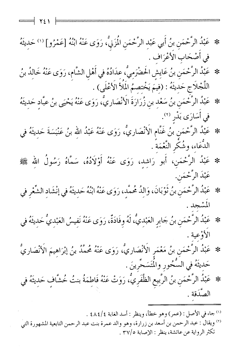 (¬2) ويقال: عبد الرحمن بن أسعد بن زرارة، وهو والد عمرة بنت عبد الرحمن التابعية المشهورة التي تكثر الرواية عن عائشة، ينظر: الإصابة 5/ 37.