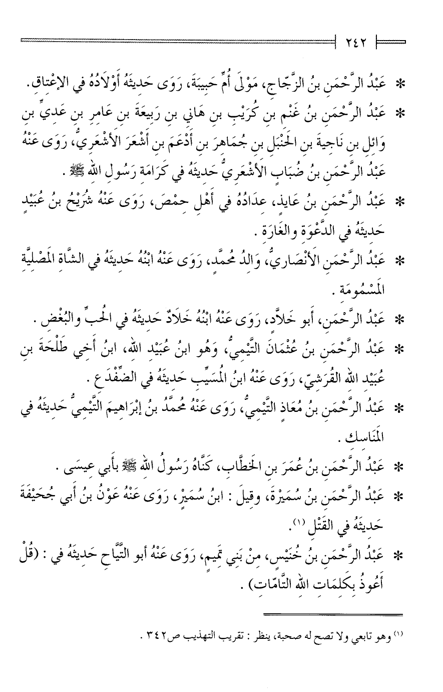 * عَبْدُ الرَّحْمَنِ بنُ خُنَيْسٍ، مِنْ بَنِي تمِيمٍ، رَوَى عَنْهُ أبو التَّيَّاحِ حَدِيثَهُ في: (قُلْ أَعُوذُ بِكَلِمَاتِ الله التَّامّاتِ).