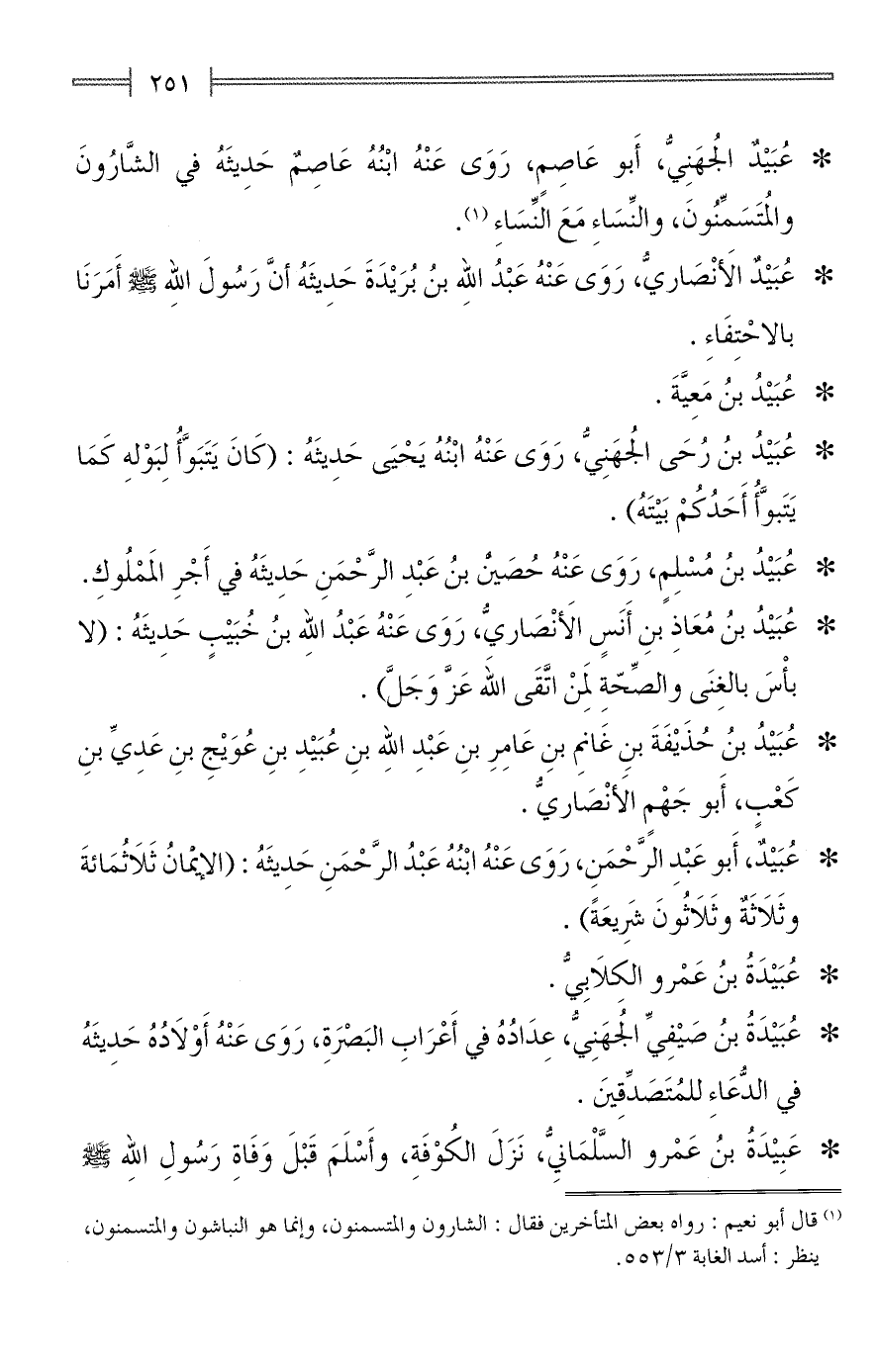 (¬1) قال أبو نعيم: رواه بعض المتأخرين فقال: الشارون والمتسمنون، وإنما هو النباشون والمتسمنون، ينظر: أسد الغابة 3/ 553.