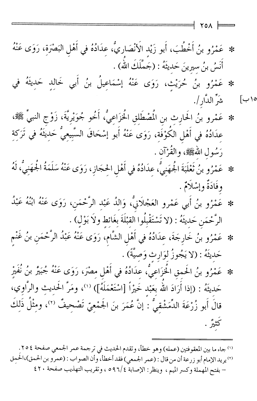 (¬2) يريد الإمام أبو زرعة أن من قال: (عمر الجمعي) فقد أخطأ، وأن الصواب: (عمرو بن الحمق)، الحَمِق -بفتح المهملة وكسر الميم، وينظر: الإصابة 4/ 596، وتقريب التهذيب صفحة 420