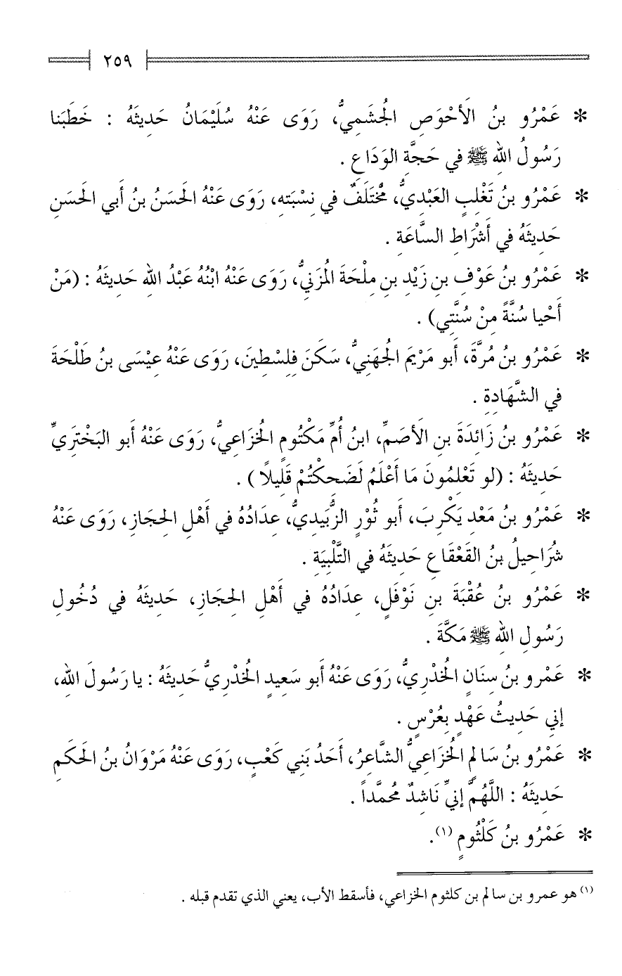 * عَمْرُو بنُ الأَحْوَصِ الجُشَمِيُّ، رَوَى عَنْهُ ابنُه سُلَيْمَانُ حَدِيثَهُ: خَطَبَنا رَسُولُ الله - صلى الله عليه وسلم - في حَجَّةِ الوَدَاعِ.