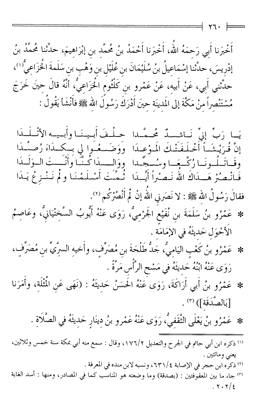 أَخْبَرنا أَبِي رَحِمَهُ الله، أَخْبَرنا أَحْمَدُ بنُ مُحمَّدِ بنِ إبْرَاهِيمَ، حدَّثنا مُحمَّدُ بنُ إدْرِيسَ، حدَّثنا إسْمَاعِيلُ بنُ سُلَيْمَانَ بنِ عُلَيْلِ بنِ وَهْبِ بنِ سَلَمةَ الخُزَاعِيُّ (¬1)، حدَّثني أَبِي، عَنْ أَبيهِ، عَنْ عَمْرو بنِ كَلْثُومٍ الخُزَاعِيُّ، أنَّهُ قالَ حِينَ خَرَجَ مُسْتَنْصِرًا مِنْ مَكَّةَ إلى المَدِينَةِ حِينَ أَدْرَكَ رَسُولَ الله - صلى الله عليه وسلم - فأَنْشَأ يَقُولُ: