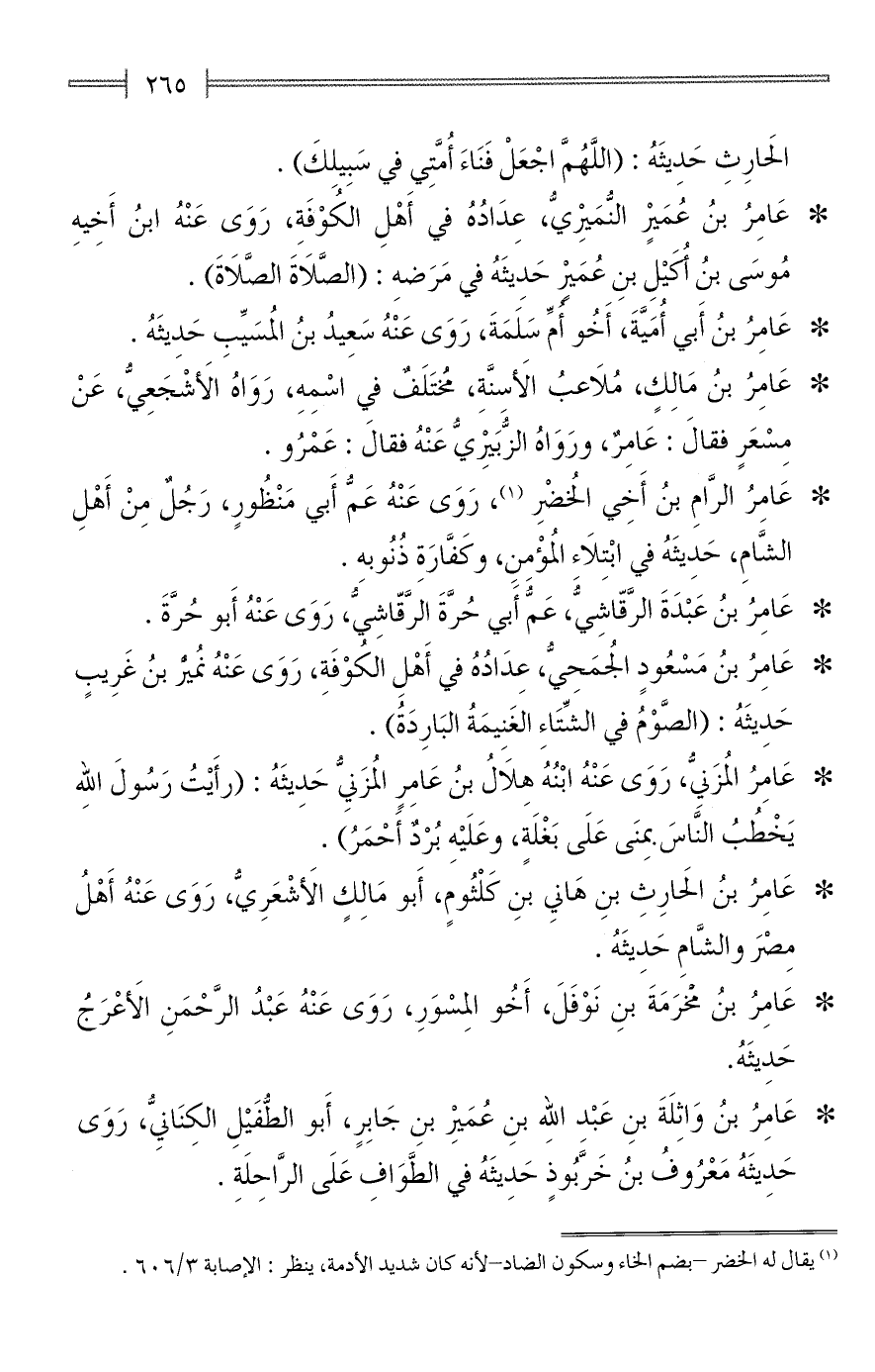 * عَامِرُ الرَّامِ بنُ أَخِي الخُضْرِ (¬1)، رَوَى عَنْهُ عَمُّ أَبي مَنْظُورٍ، رَجُلٌ مِنْ أَهْلِ الشَّامِ، حَدِيثَهُ في ابْتِلَاءِ المُؤْمِنِ، وكَفَّارَةِ ذُنُوبهِ.
