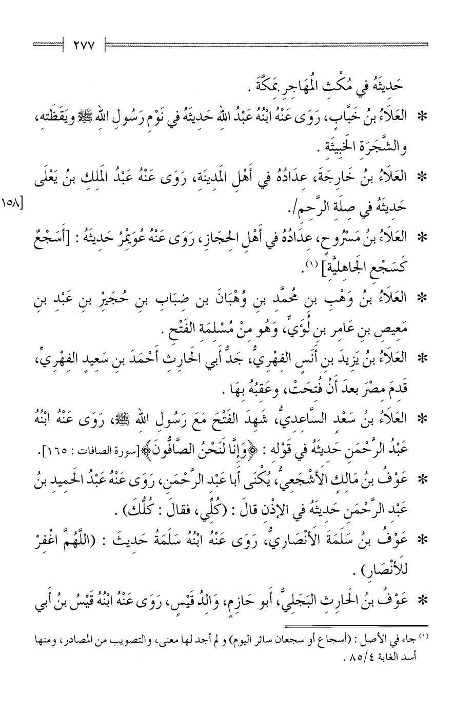 * العَلَاءُ بنُ مَسْرُوحٍ، عِدَادُهُ في أَهْلِ الحِجَازِ، رَوَى عَنْهُ عُوَيْم حَدِيثَهُ: [أَسَجْعٌ كَسَجْعِ الجَاهِليَّةِ] (¬1).