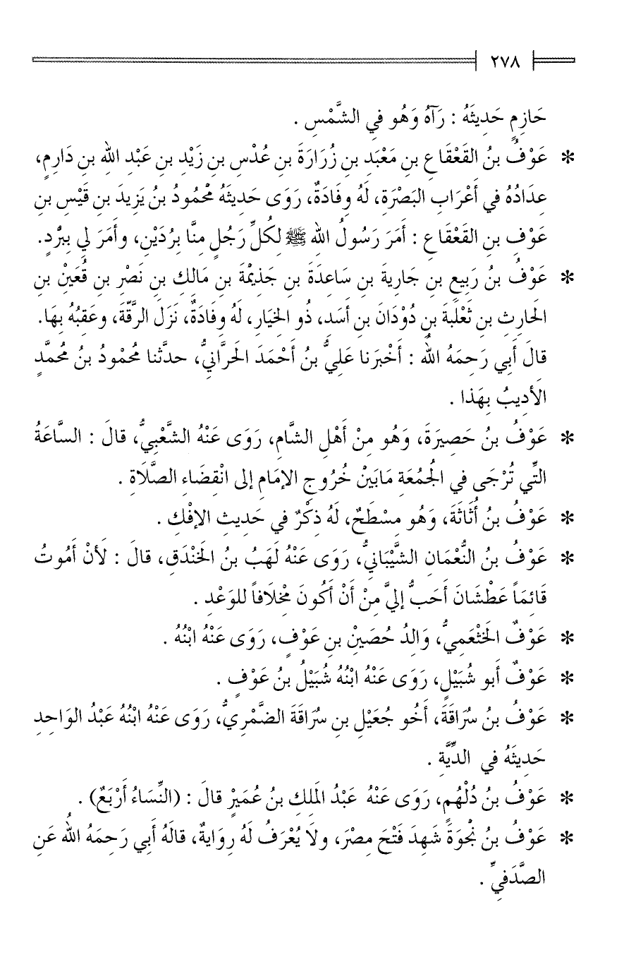 * عَوْفُ بنُ حَصِيرَةَ، وَهُو مِنْ أَهْلِ الشَّامِ، رَوَى عَنْهُ الشَّعْبِيُّ، قالَ: السَّاعَةُ التِّي تُرْجَى في الجُمُعَةِ مَا بَين خُرُوج الإمَامِ إلى انْقِضَاءِ الصَّلَاةِ.