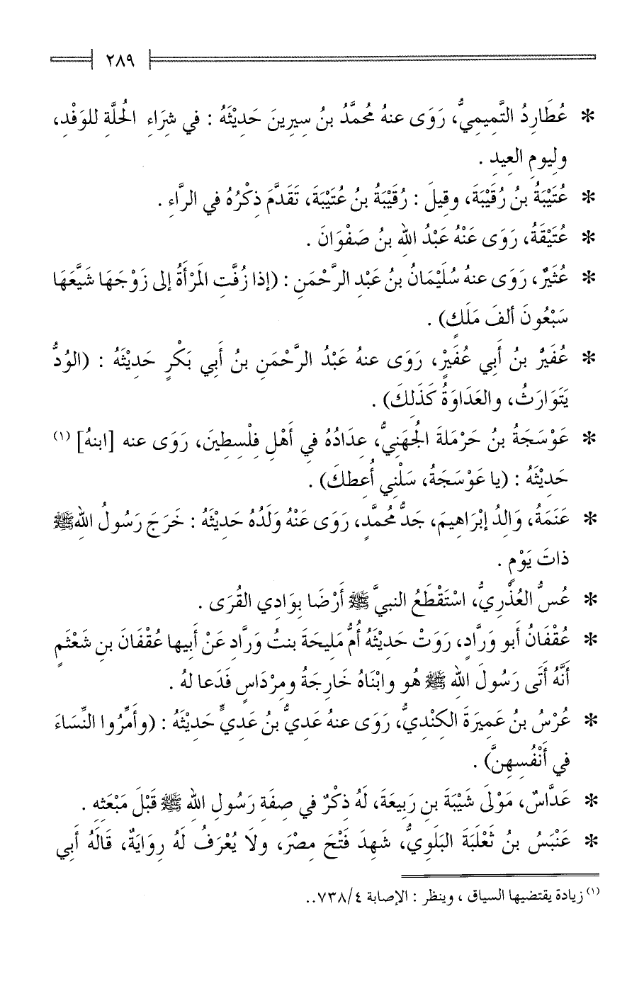 * عُثَيْر، رَوَى عنهُ سُلَيْمَانُ بنُ عَبْدِ الرَّحْمَنِ: (إذا زُفَّتِ المَرْأَةُ إلى زَوْجَهَا شَيَّعَهَا سَبْعُونَ ألفَ مَلَكٍ).