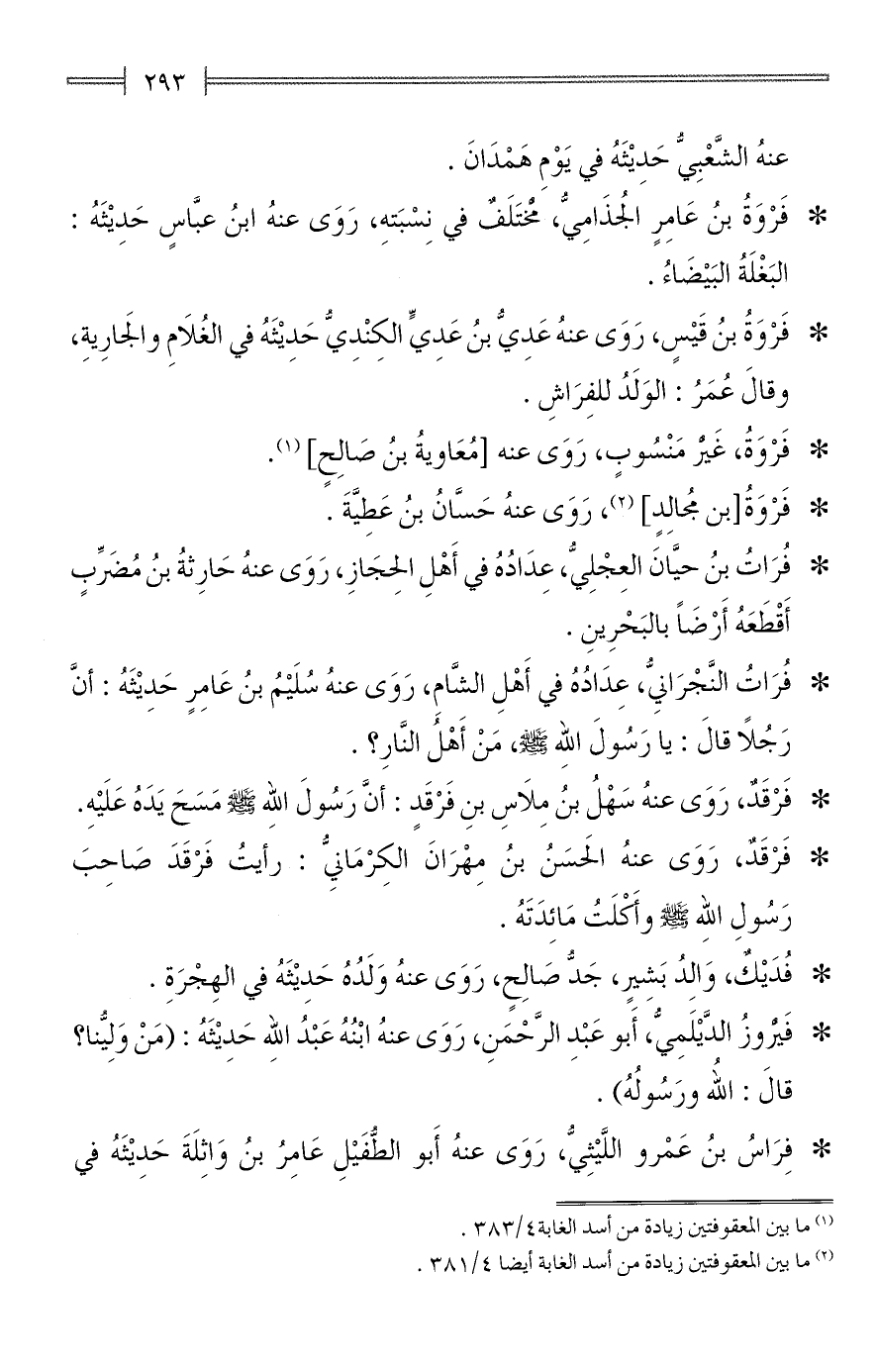 * فَرْوَةُ بنُ عَامِرٍ الجُذَامِيُّ، مُخْتَلَفٌ في نِسبَتهِ، رَوَى عنهُ ابنُ عبَّاسٍ حَدِيْثَهُ: البَغْلَةُ البَيْضَاءُ.