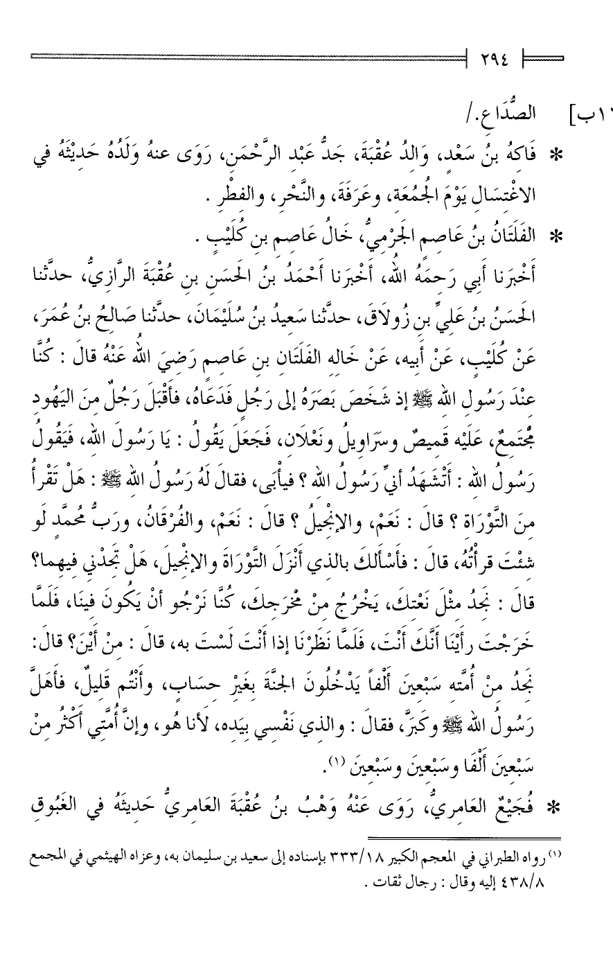 أَخْبَرنا أَبِي رَحِمَهُ الله، أَخْبَرنا أَحْمَدُ بنُ الحَسَنِ بنِ عُقْبَةَ الرَّازِيُّ، حدَّثنا الحَسَنُ بنُ عَلِيِّ بنِ زُولَاقَ، حدَّثنا سَعِيدُ بنُ سُلَيْمَانَ، حدَّثنا صَالِحُ بنُ عُمَرَ، عَنْ كُلَيْبٍ، عَنْ أَبِيه، عَنْ خَالِهِ الفَلَتَانِ بنِ عَاصِمٍ رَضِيَ الله عَنْهُ قالَ: كُنَّا عِنْدَ رَسُولِ الله - صلى الله عليه وسلم - إذ شَخَصَ بَصَرَهُ إلى رَجُلٍ فَدَعَاهُ، فأَقْبَلَ رَجُلٌ مِنَ اليَهُودِ مجْتَمِعٌ، عَلَيْه قَمِيصٌ وسَرَاوِيلُ ونَعْلَانِ، فَجَعَلَ يَقُولُ: يَا رَسُولَ الله، فَيَقُولُ رَسُولُ الله: أَتْشَهَدُ أنِّي رَسُولُ الله؟ فيأْبَى، فقالَ لَهُ رَسُولُ الله - صلى الله عليه وسلم -: هَلْ تَقْرأُ مِنَ التَّوْرَاةِ؟ قالَ: نَعَمْ، والإنْجِيلُ؟ قالَ: نَعَمْ، والفُرْقَانُ، ورَبُّ مُحمَّدٍ لَو شِئْتَ قرأْتُهُ، قالَ: فأَسْأَلكَ بالذِي أَنْزَلَ التَّوْرَاةَ والإنجِيلَ، هَلْ تَجِدْني فِيهِما؟ قالَ: نَجِدُ مِثْلَ نَعْتِكَ، يَخْرُجُ مِنْ مخْرَجِكَ، كُنَّا نَرْجُو أنْ يَكُونَ فِينَا، فَلَمَّا خَرَجْتَ رأَيْنَا أَنَّكَ أَنْتَ، فَلَمَّا نَظَرْنَا إذا أَنْتَ لَسْتَ به، قالَ: مِنْ أَيْنَ؟ قالَ: نَجِدُ مِنْ أُمَّتهِ سَبْعِينَ أَلْفًا يَدْخُلُونَ الجنَّةَ بِغَير حسَابٍ، وأَنْتُم قَلِيلٌ، فأَهَلَّ رَسُولُ الله - صلى الله عليه وسلم - وكَبَّرَ، فقالَ: والذِي نَفْسِي بِيَدِه، لأَنا هُو، وإنَّ أُمَّتِي أَكْثرُ مِنْ سَبْعِينَ أَلْفَا وسَبْعِينَ وسَبْعِينَ (¬1).