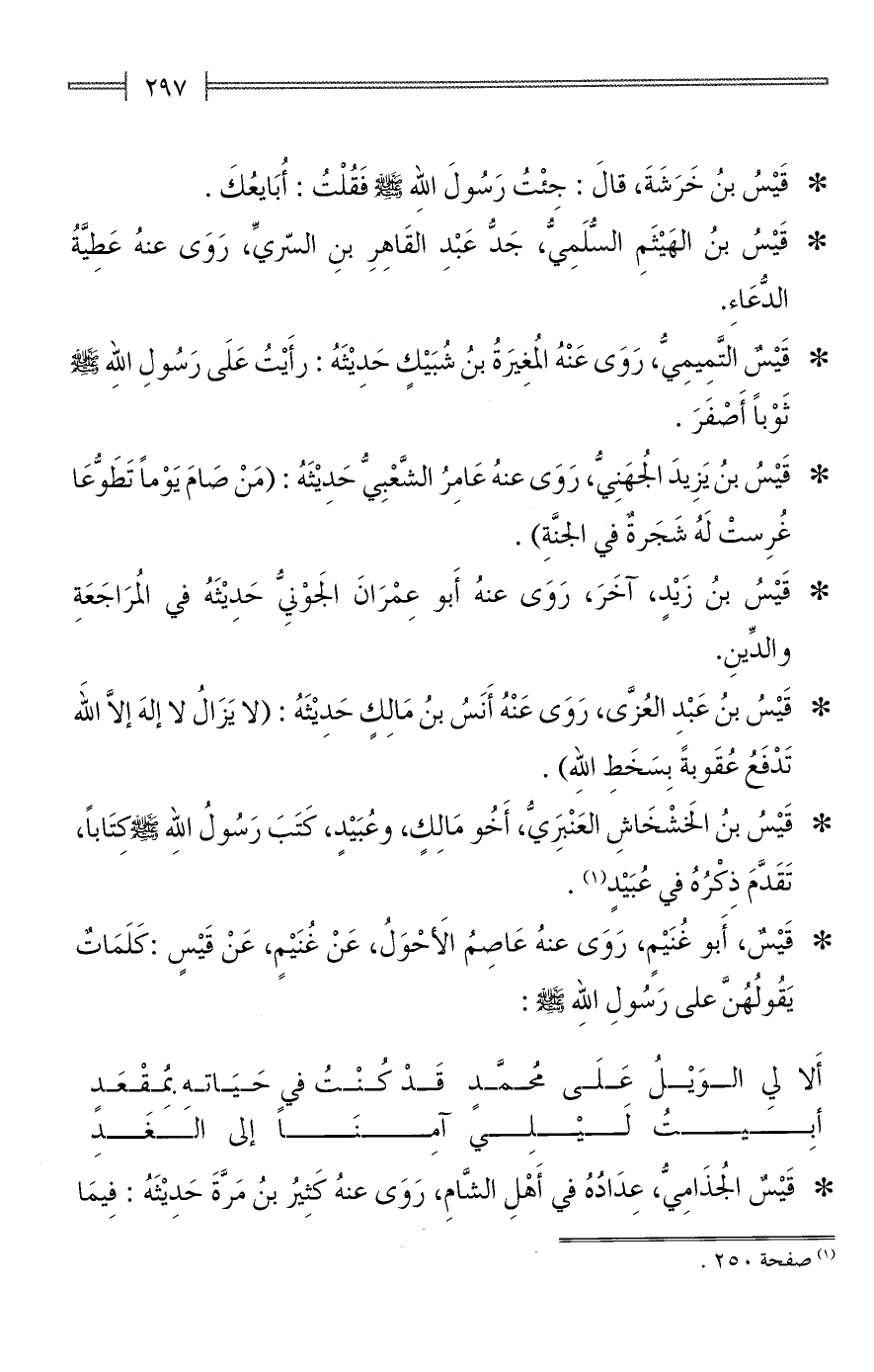 * قَيْسُ بنُ خَرَشَةَ، قالَ: جِئْتُ رَسُولَ الله - صلى الله عليه وسلم - فَقُلْتُ: أُبَايعُكَ.
