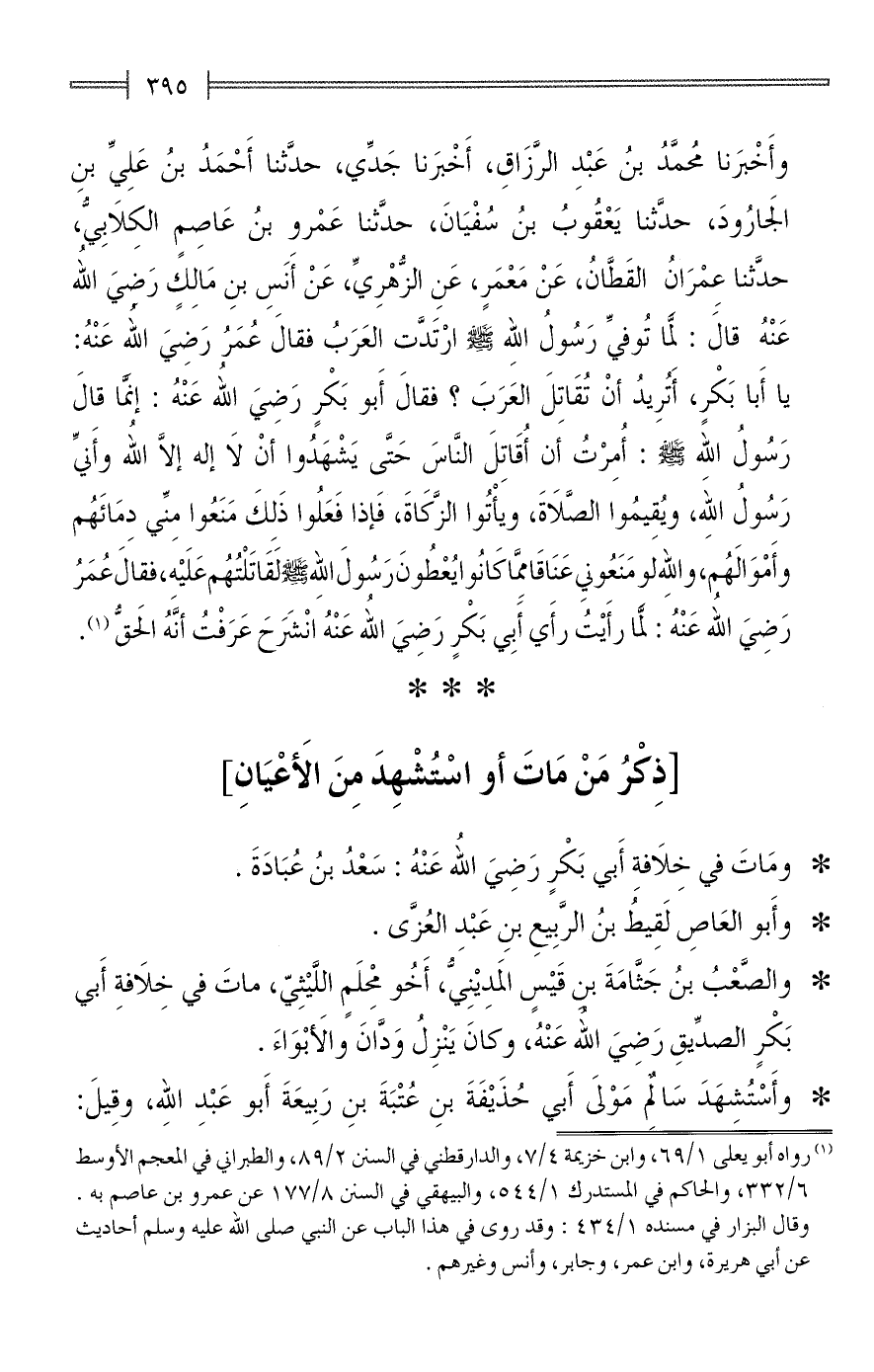 وأَخْبَرنا مُحمَّدُ بنُ عَبْدِ الرَّزَاقِ، أَخْبَرنا جَدِّي، حدَّثنا أَحْمَدُ بنُ عَلِيِّ بنِ الجَارُودَ، حدَّثنا يَعْقُوبُ بنُ سُفْيَانَ، حدَّثنا عَمْرو بنُ عَاصِمٍ الكِلَابِيُّ، حدَّثنا عِمْرَانُ القَطَّانُ، عَنْ مَعْمَرٍ، عَنِ الزُّهْرِيِّ، عَنْ أَنَسِ بنِ مَالِكٍ رَضيَ الله عَنْهُ قالَ: لمَّا تُوفيِّ رَسُولُ الله - صلى الله عليه وسلم - ارْتَدَّت العَرَبُ فقالَ عُمَرُ رَضِيَ الله عَنْهُ: يا أَبا بَكْرٍ، أَتُرِيدُ أنْ تُقَاتِلَ العَرَبَ؟ فقالَ أَبو بَكْرٍ رَضِيَ الله عَنْهُ: إنَّمَا قالَ رَسُولُ الله - صلى الله عليه وسلم -: أُمِرْتُ أن أُقَاتِلَ النَّاسَ حَتَّى يَشْهَدُوا أنْ لَا إله إلَّا الله وأَنِّي رَسُولُ الله، ويُقِيمُوا الصَّلَاةَ، ويأْتُوا الزَّكَاةَ، فَإذا فَعَلُوا ذَلِكَ مَنَعُوا مِنِّي دِمَائَهُم وأَمْوَالَهُم، والله لو مَنَعُونيِ عَنَاقَا ممَّا كَانُوا يُعْطُونَ رَسُولَ الله - صلى الله عليه وسلم - لَقَاتَلْتُهُم عَلَيْه، فقالَ عُمَرُ رَضِيَ الله عَنْهُ: لمَّا رأَيْتُ رأَي أَبِي بَكْرٍ رَضِيَ الله عَنْهُ انْشَرَحَ عَرَفْتُ أنَّهُ الحَقُّ (¬1).
