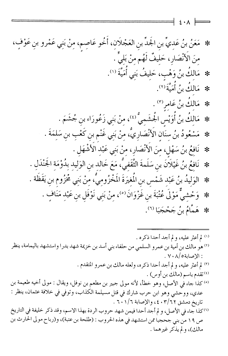 (¬6) كذا جاء في الأصل، ولم أجد أحدا فيمن شهد حروب الردة بهذا الاسم، وقد ذكر خليفة في التاريخ ص 19 من بني جحجبا ممن استشهد في هذه الحروب: (طلحة بن عتبة)، و (رباح مولى الحارث بن مالك)، ولم يذكر غيرهما.
