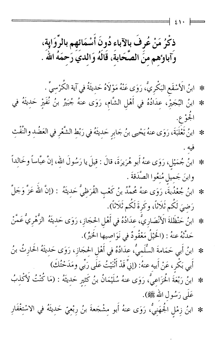ذِكْرُ مَنْ عُرِفَ بالآباءِ دُونَ أَسْمَائِهِم بالرِّوَاية، وآباؤهِم مِنَ الصَّحَابةَ، قَالَهُ وَالِدي رَحِمَهُ الله.