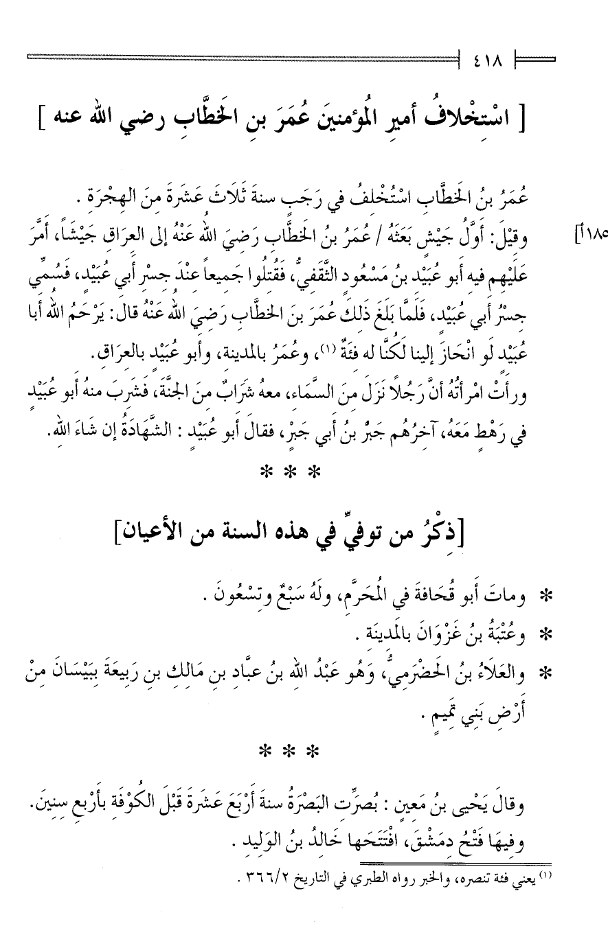 وقالَ يَحْيى بنُ مَعِينٍ: بُصَرِّتِ البَصْرَةُ سنةَ أَرْبَعَ عَشَرةَ قَبْلَ الكُوْفَةِ بأَرْبعِ سِنِينَ. وفِيهَا فَتْحُ دِمَشْقَ، افْتَتَحَها خَالِدُ بنُ الوَلِيدِ.