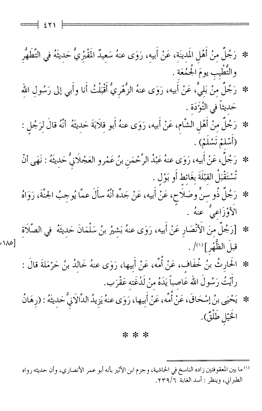 * رَجُلٌ ذُو سِنٍّ وصَلَاحٍ، عَنْ أَبيه، عَنْ جَدِّه أنَّهُ سأَلَ عمَّا يُوجِبُ الجنَّةَ، رَوَاهُ الأَوْزَاعِيُّ عنهُ.