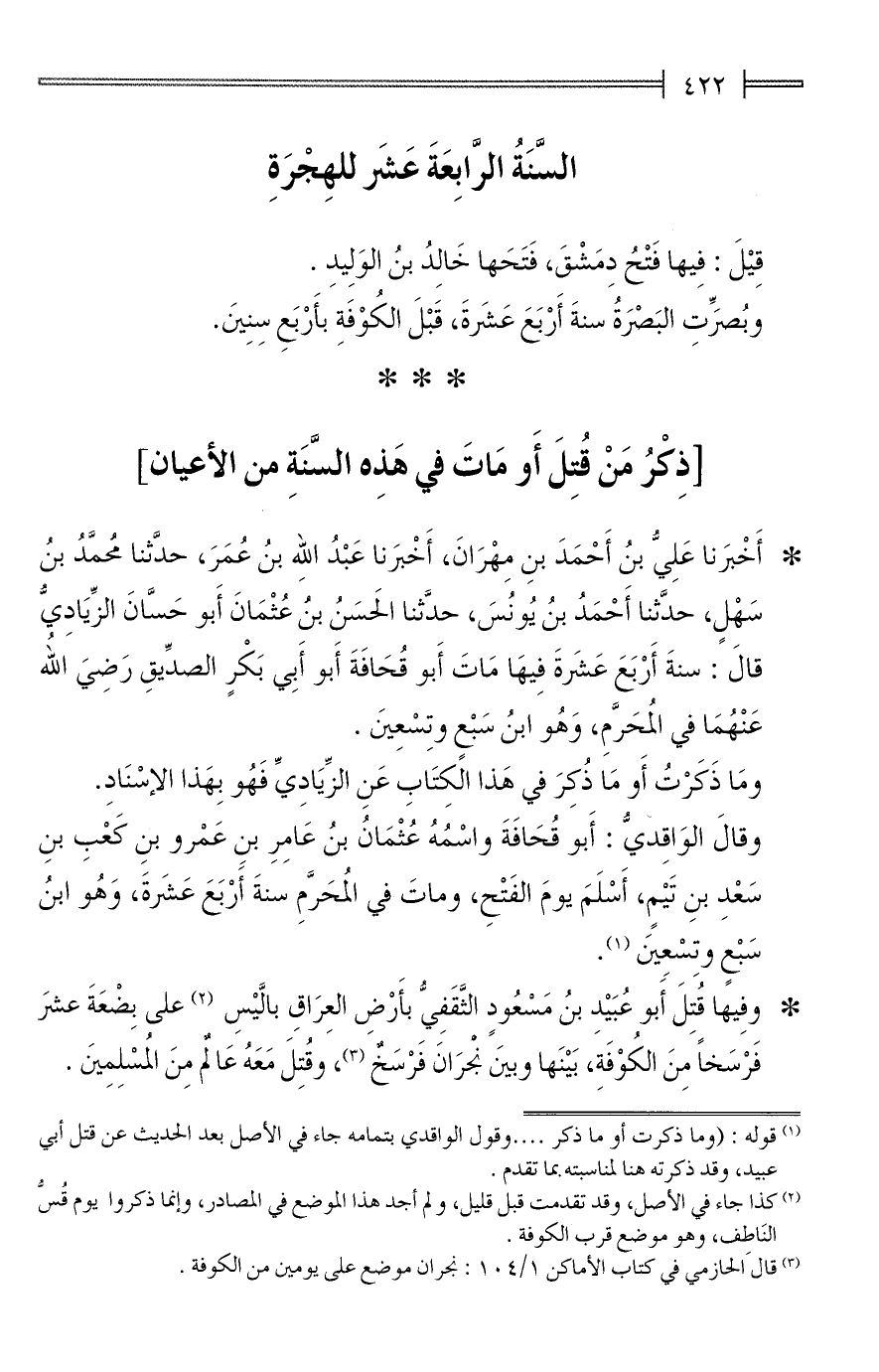 * أَخْبَرنا عَلِيُّ بنُ أَحْمَدَ بنِ مِهْرَانَ، أَخْبَرنا عَبْدُ الله بنُ عُمَرَ، حدَّثنا مُحمَّدُ بنُ سَهْلٍ، حدَّثنا أَحْمَدُ بنُ يُونُسَ، حدَّثنا الحَسَنُ بنُ عُثْمَانَ أَبو حَسَّانَ الزِّيَادِيُّ قالَ: سنةَ أَرْبَعَ عَشَرةَ فِيهَا مَاتَ أَبو قُحَافَةَ أَبو أَبِي بَكْرٍ الصدِّيقِ رَضِيَ اللهُ عَنْهُمَا في المُحَرَّمِ، وَهُو ابنُ سَبْعٍ وتِسْعِينَ.