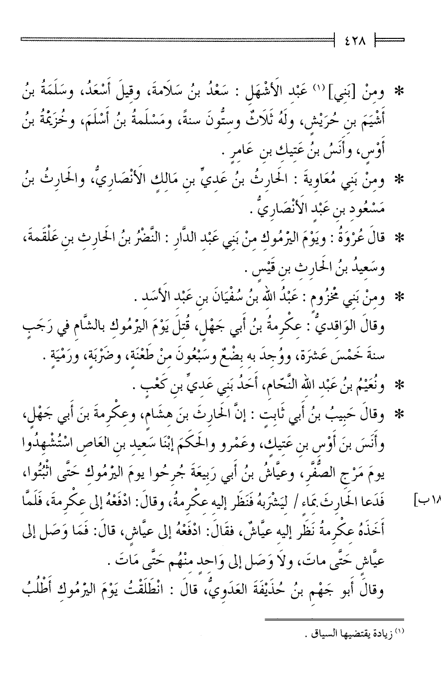 * وقالَ حَبِيبُ بنُ أَبي ثَابِتٍ: إنَّ الحَارِثَ بنَ هِشَامٍ، وعِكْرِمةَ بنَ أَبي جَهْلٍ، وأَنَسَ بنَ أَوْس بنِ عَتِيكٍ، وعَمْرو والحَكَمَ ابْنَا سَعِيدِ بنِ العَاصِ اسْتُشْهِدُوا يومَ مَرْجِ الصُّفَّرِ، وعيَّاشُ بنُ أَبي رَبِيعَةَ جُرِحُوا يومَ اليرْمُوكِ حَتَّى اثْبُتُوا، فَدَعا الحَارِثَ بِمَاءٍ لِيَشرَبهُ فَنَظَر إليهِ عِكْرِمةُ، وقالَ: ادْفَعْهُ إلى عِكْرِمةَ، فَلَمَّا أَخَذَهُ عِكْرِمةُ نَظَر إليهِ عيَّاشٌ، فقَالَ: ادْفَعْهُ إلى عيَّاشٍ، قالَ: فَمَا وَصَل إلى عيَّاشٍ حَتَّى ماتَ، ولَا وَصَل إلى وَاحدٍ مِنْهُم حَتَّى مَاتَ.