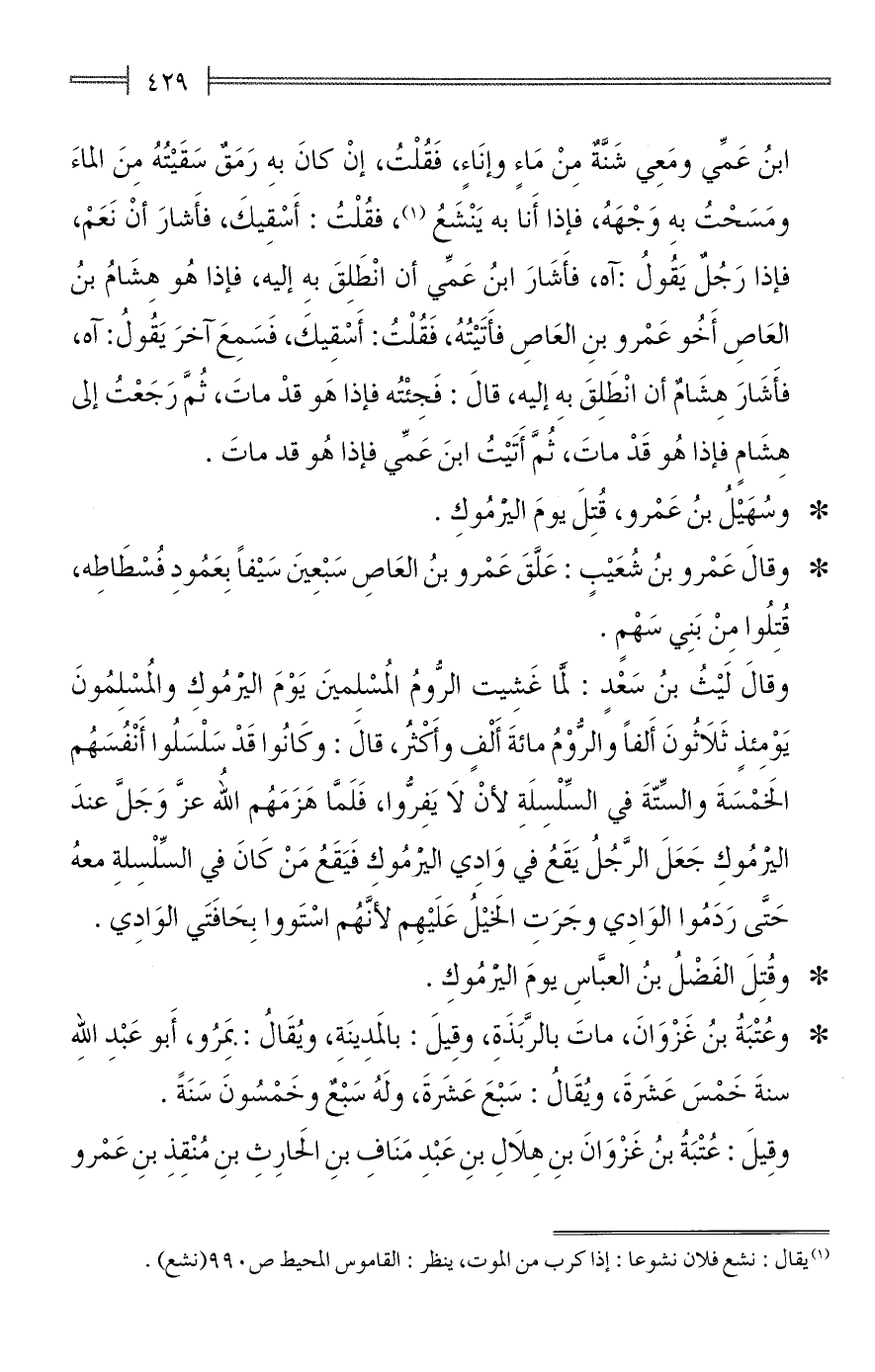 ابنُ عَمِّي ومَعِي شَنَّةٌ مِنْ مَاءٍ وإنَاءٍ، فَقُلْتُ، إنْ كانَ بهِ رَمَقٌ سَقَيْتُهُ مِنَ الماءَ ومَسَحْتُ بهِ وَجْهَهُ، فإذا أَنا به يَنْشَعُ (¬1)، فقُلْتُ: أَسْقِيكَ، فأَشارَ أنْ نَعَمْ، فإذا رَجُلٌ يَقُولُ: آه، فأَشَارَ ابنُ عَمِّي أن انْطَلِقَ بهِ إليه، فإذا هُو هِشَامُ بنُ العَاصِ أَخُو عَمْرو بنِ العَاصِ فأَتَيْتُهُ، فَقُلْتُ: أَسْقِيكَ، فَسَمِعَ آخرَ يَقُولُ: آه، فأَشَارَ هِشَامٌ أن انْطَلِقَ بهِ إليه، قالَ: فَجِئْتُه فإذا هَو قدْ ماتَ، ثُمَّ رَجَعْتُ إلى هِشَامٍ فإذا هُو قَدْ ماتَ، ثُمَّ أَتَيْتُ ابنَ عَمِّي فإذا هُو قد ماتَ.