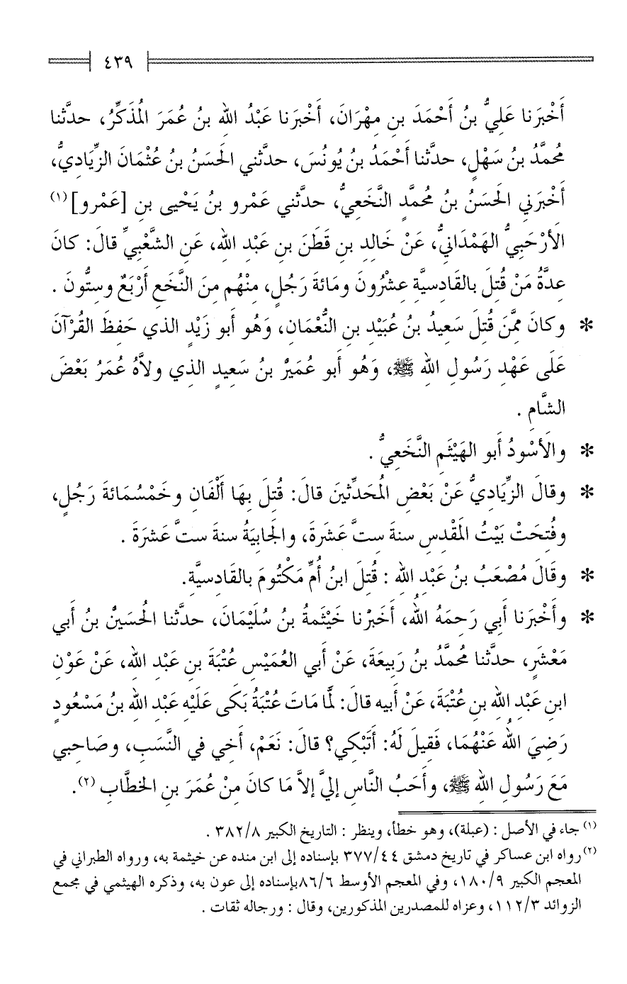 أَخْبَرنا عَلِيُّ بنُ أَحْمَدَ بنِ مِهْرَانَ، أَخْبَرنا عَبْدُ اللهِ بنُ عُمَرَ المُذَكِّرُ، حدَّثنا مُحمَّدُ بنُ سَهْلٍ، حدَّثنا أَحْمَدُ بنُ يُونُسَ، حدَّثني الحَسَنُ بنُ عُثْمَانَ الزِّيَادِيُّ، أَخْبَرنيِ الحَسَنُ بنُ مُحمَّدٍ النَّخَعِيُّ، حدَّثني عَمْرو بنُ يَحْيى بنِ [عَمْرو] (¬1) الأَرْحَبِيُّ الهَمْدَانِيُّ، عَنْ خَالِدِ بنِ قَطَنَ بنِ عَبْدِ اللهِ، عَنِ الشَّعْبِيِّ قالَ: كانَ عِدَّةُ مَنْ قُتِلَ بالقَادِسيَّةِ عِشْرُونَ ومَائةَ رَجُلٍ، مِنْهُم مِنَ النَّخَعِ أَرْبَعٌ وسِتُّونَ.