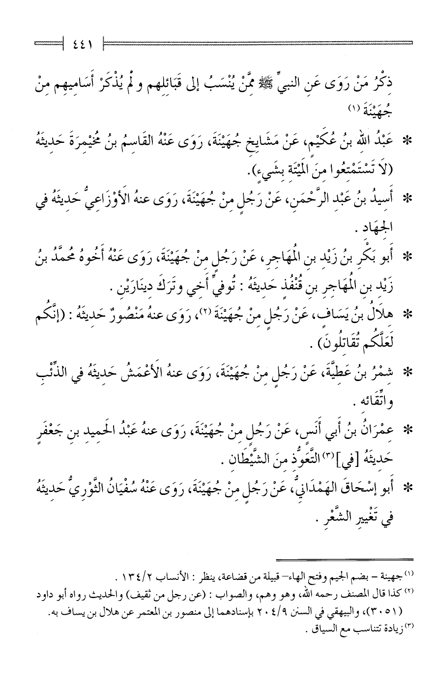 ذِكْرُ مَنْ رَوَى عَنِ النبيِّ - صلى الله عليه وسلم - مِمَّنْ يُنْسَبُ إلى قَبَائِلِهم ولم يُذْكَرْ أَسَامِيهِم مِنْ جُهَيْنَةَ (¬1).