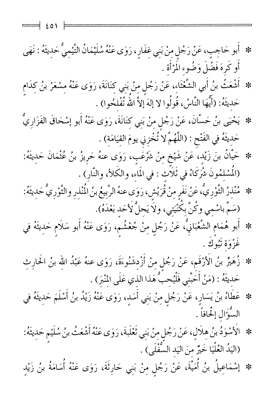* الأَسْوَدُ بنُ هِلَالٍ، عَنْ رَجُلٍ مِنْ بَنِي ثَعْلَبةَ، رَوَى عَنْهُ أَشْعَثُ بنُ سُلَيْمٍ حَدِيثَهُ: (اليَدُ العُلْيَا خَير مِنَ اليَدِ السُّفْلَى).