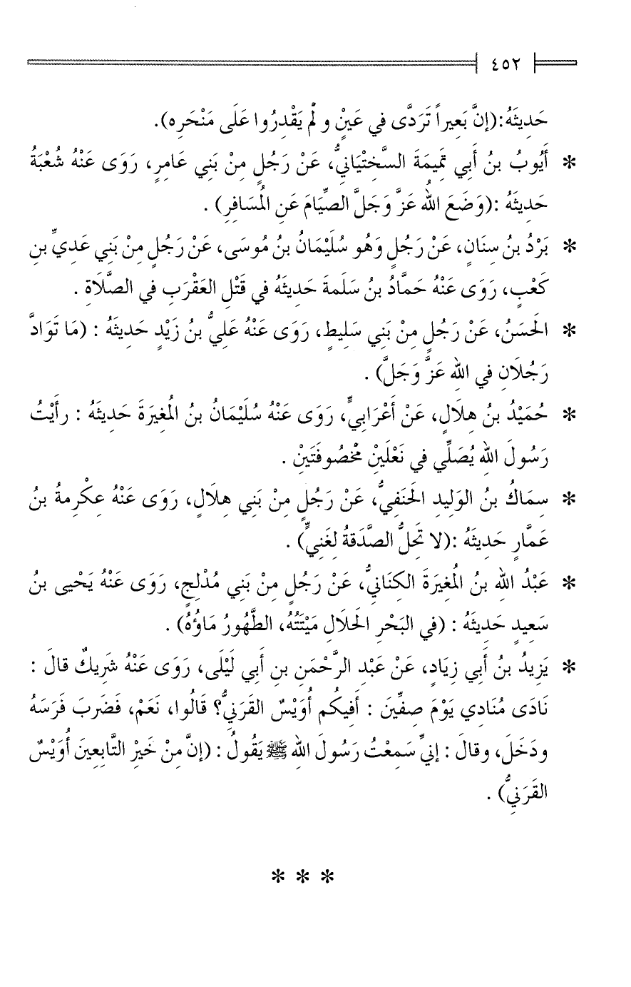 * حُمَيْدُ بنُ هِلَالٍ، عَنْ أَعْرَابِيٍّ، رَوَى عَنْهُ سُلَيْمَانُ بنُ المُغِيرَةَ حَدِيثَهُ: رأَيْتُ رَسُولَ الله يُصَلِّي في نَعْلَينِ مخْصُوفَتَينِ.