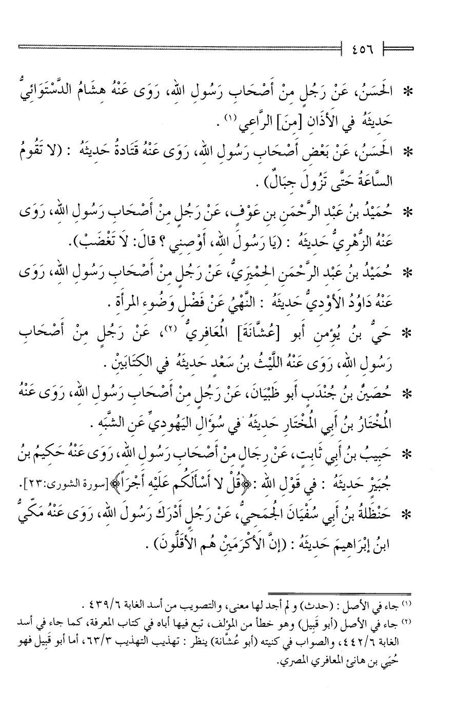 * حَبِيبُ بنُ أَبِى ثَابِتٍ، عَنْ رِجَالٍ مِنْ أَصْحَابِ رَسُولِ الله، رَوَى عَنْهُ حَكِيمُ بنُ جُبَيرٍ حَدِيثَهُ: فيِ قَوْلِ الله: {قُلْ لا أَسْأَلَكُم عَلَيْهِ أَجْرًا} [سورة الشورى: 23].