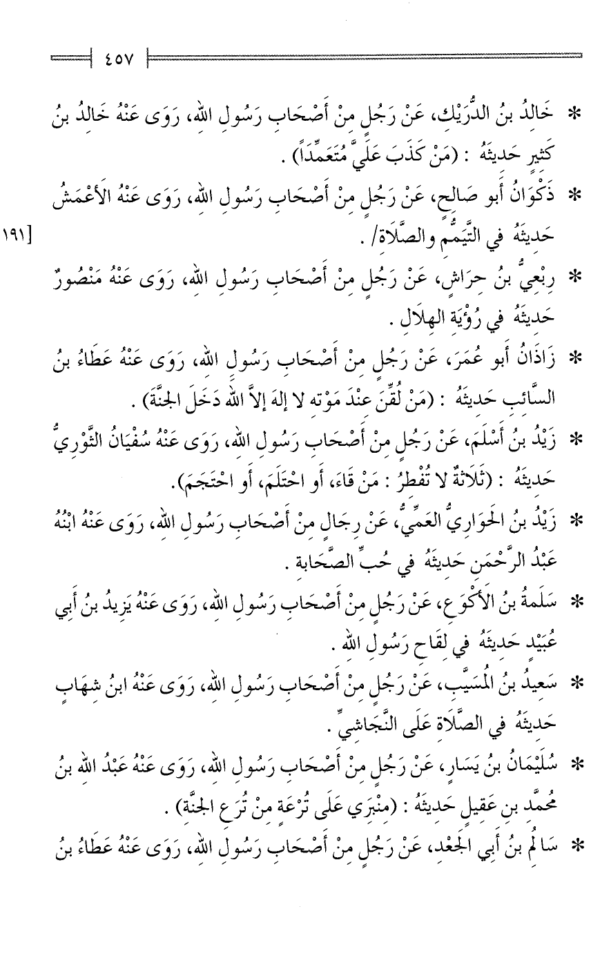 * خَالِدُ بنُ الدُّرَيْكِ، عَنْ رَجُلٍ مِنْ أَصحَابِ رَسُولِ اللهِ، رَوَى عَنْهُ خَالِدُ بنُ كَثِيرٍ حَدِيثَهُ: (مَنْ كَذَبَ عَلَيَّ مُتَعَمِّدًا).