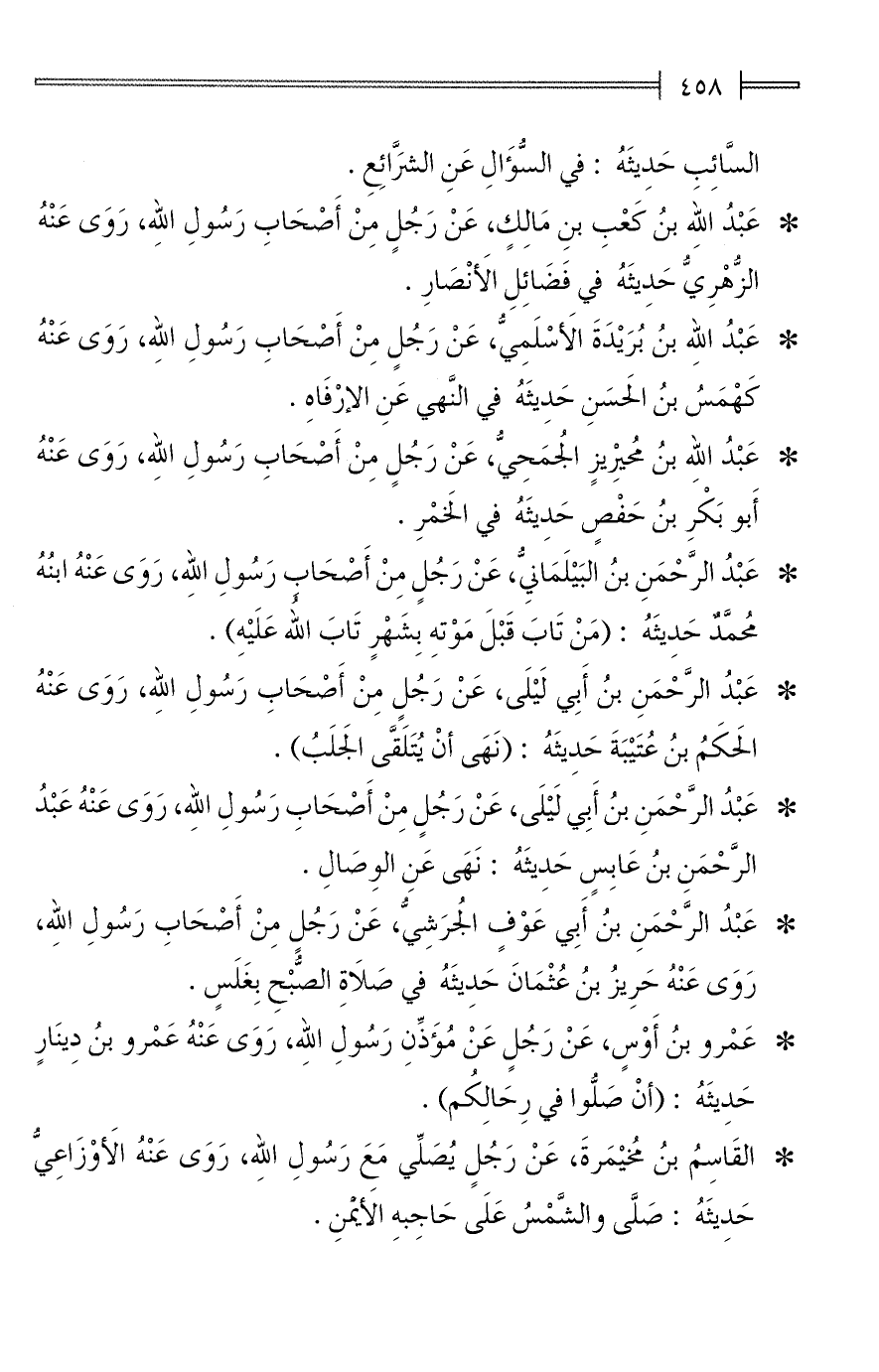 * عَبْدُ الله بنُ مُحيرِيزٍ الجُمَحِيُّ، عَنْ رَجُلٍ مِنْ أَصحَابِ رَسُولِ الله، رَوَى عَنْهُ أَبو بَكْرِ بنُ حَفْصٍ حَدِيثَهُ في الخَمْرِ.