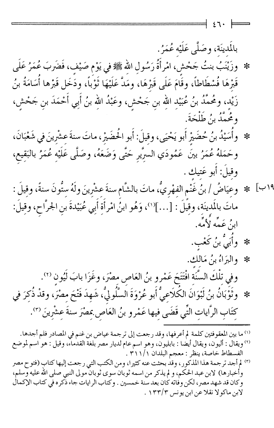 * وعِيَاضُ بنُ غَنْمٍ الفِهْرِيُّ، ماتَ بالشَّامِ سنةَ عِشرينَ ولَهُ سِتُّونَ سنةً، وقِيلَ: ماتَ بالمَدينَةِ، وقِيلَ: [...] (¬1)، وَهُو ابنُ امْرأَةِ أَبِي عُبَيْدةَ بنِ الجرَّاحِ، وقِيلَ: ابنُ عَمِّه لأُمِّه.